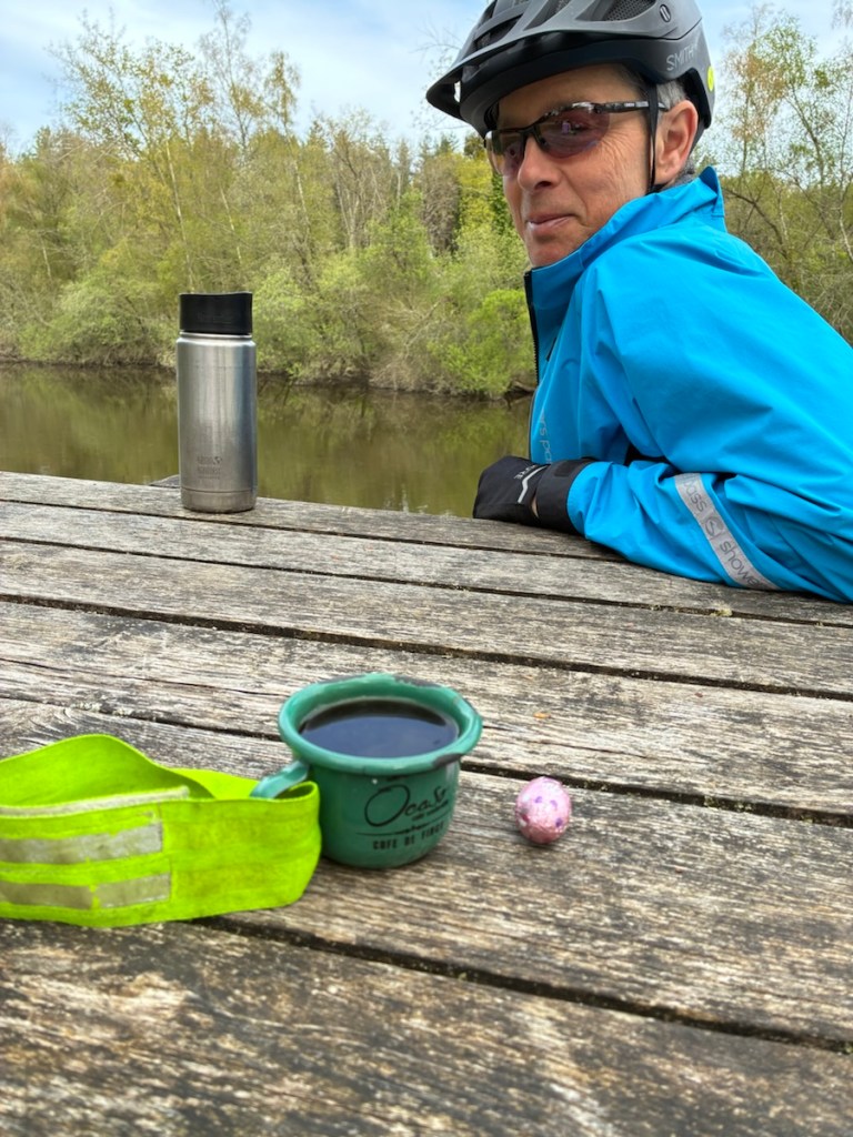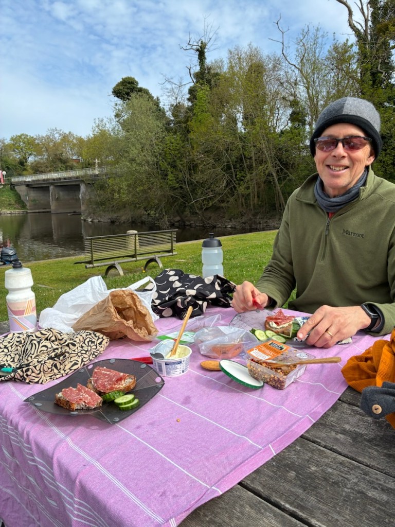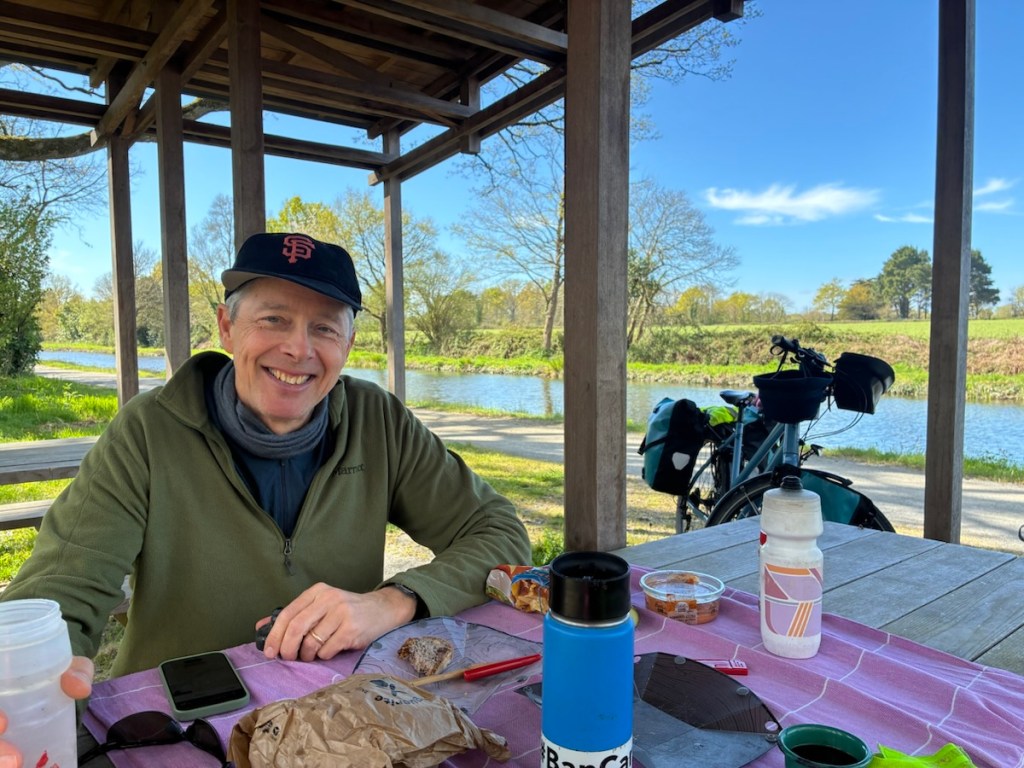 Here’s a tiny Rich riding past a boat in a canal section.And here he is waiting for me to catch up in Fégréac on a section of L’Isac River. So many birds!Between those two photos was a coffee/tea/Easter chocolate break.And a lunch break. Although the path was busy this Easter Sunday, we always found places to stop and sit.The back of my bike. The front of Rich’s bike.