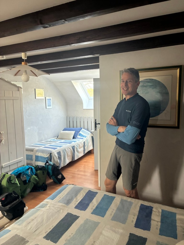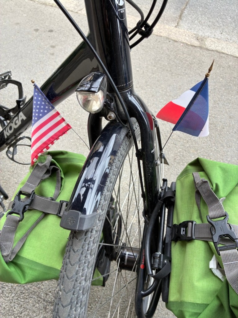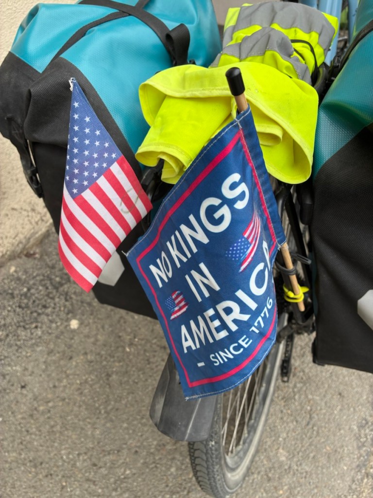 In our travels around the world we’ve always felt welcome as Americans, or at least not disliked. We always say people are good at distinguishing between a person and the country’s politics. But these are different times. Awful things are happening and the USA is responsible. We questioned if we wanted our American flags on our bikes at all. But we are American, we have to own it. Rich has a French flag to show our affection for France, and my No Kings flag hopefully conveys our lack of support for the current administration. We’ve had quite a few conversations so far and no French person has been anything but kind and understanding and as upset as we are about the war.