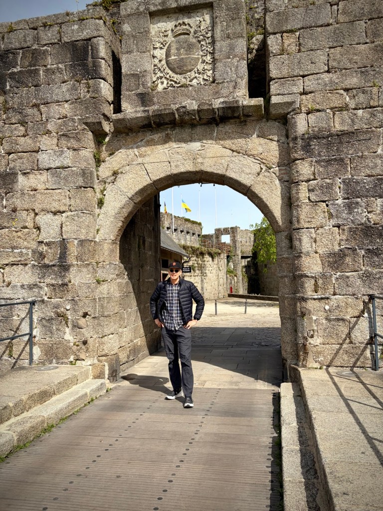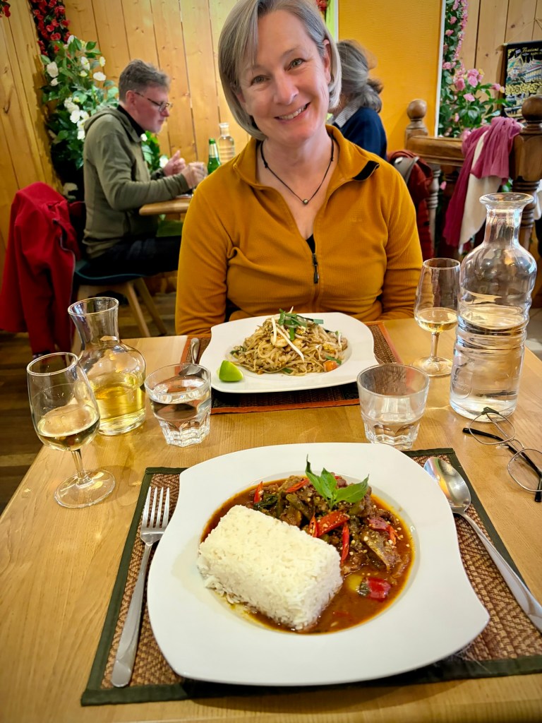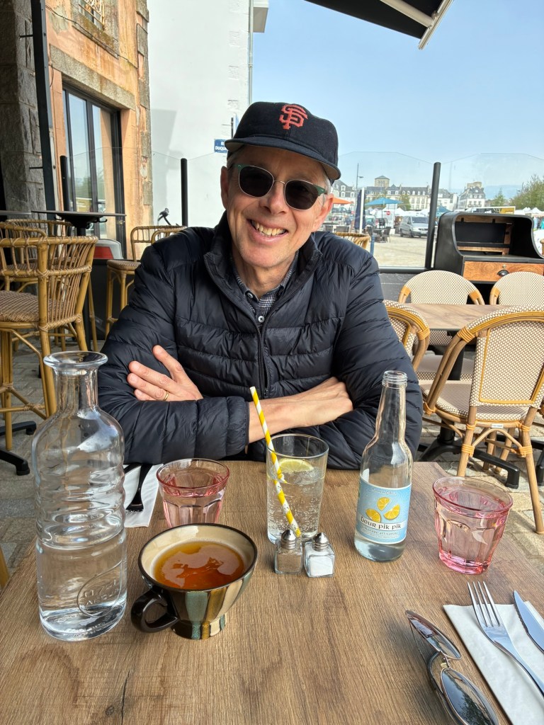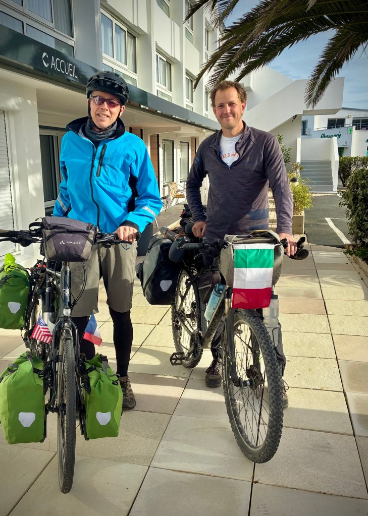 I’m ready to walk after a day in bed, and the lunchtime crowds are thin.You can walk the ramparts for free now as there used to be a fee, but I suspect too many people complained, as it’s a bit overrated, even when you explore at peak French lunchtime (12:30-1:30), a great travel hack anywhere in France.The ramparts take you behind the Main Street and restaurants, complete with Medieval plastic skylights and vents and exhausting fried food smell….Ok, I’m a bit crazy as my second meal recovering was a fairly spicy Thai curry. But it tasted so good. That look from Cheryl is “Are you sure about this?”Meeting this friendly cycle tourist Lukas leaving our second hotel in Concarneau cheered me up. He is Czech but lives in Italy and is currently circumnavigating the European Coasts to raise awareness for organ donorship. @ Wild.lukaas . The owner of our hotel had comped him a room and we gave him a little dinner money too -:)