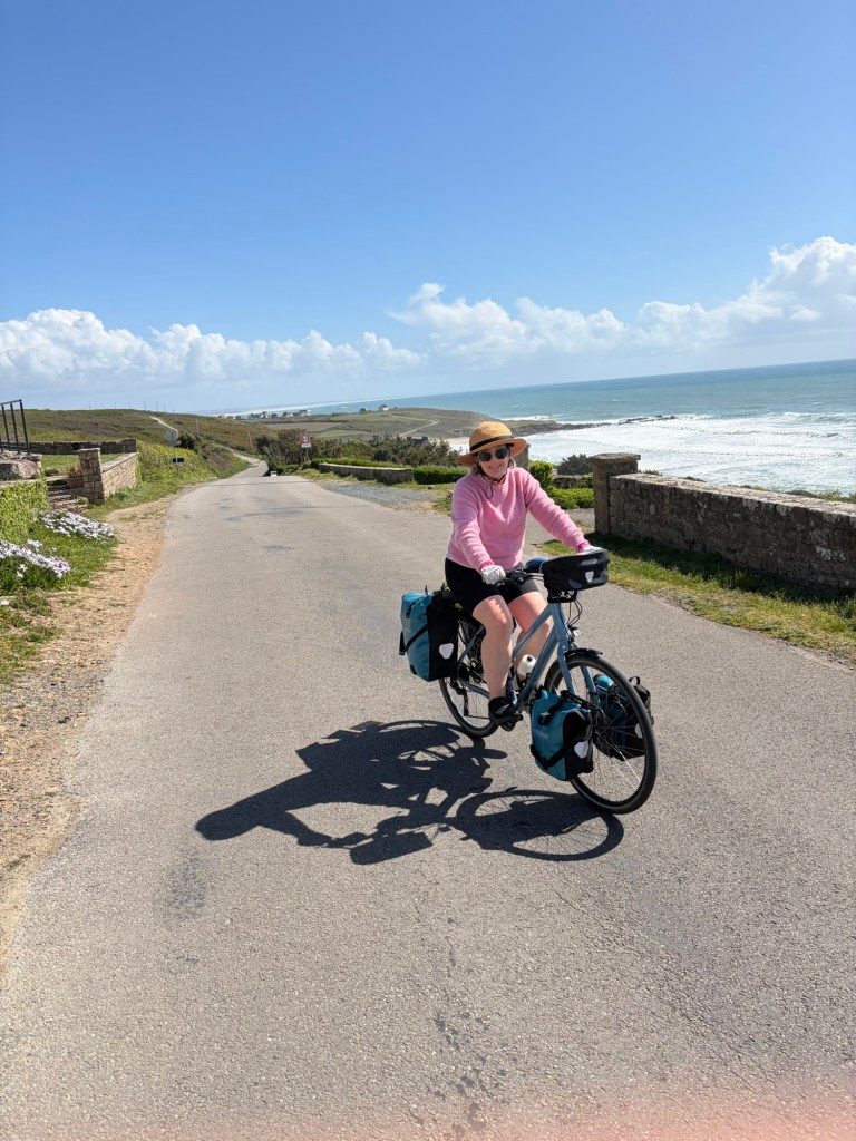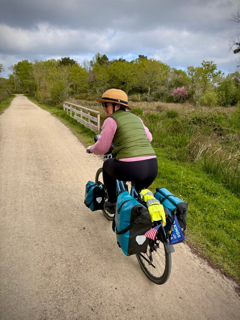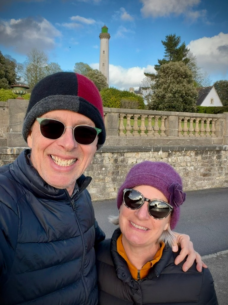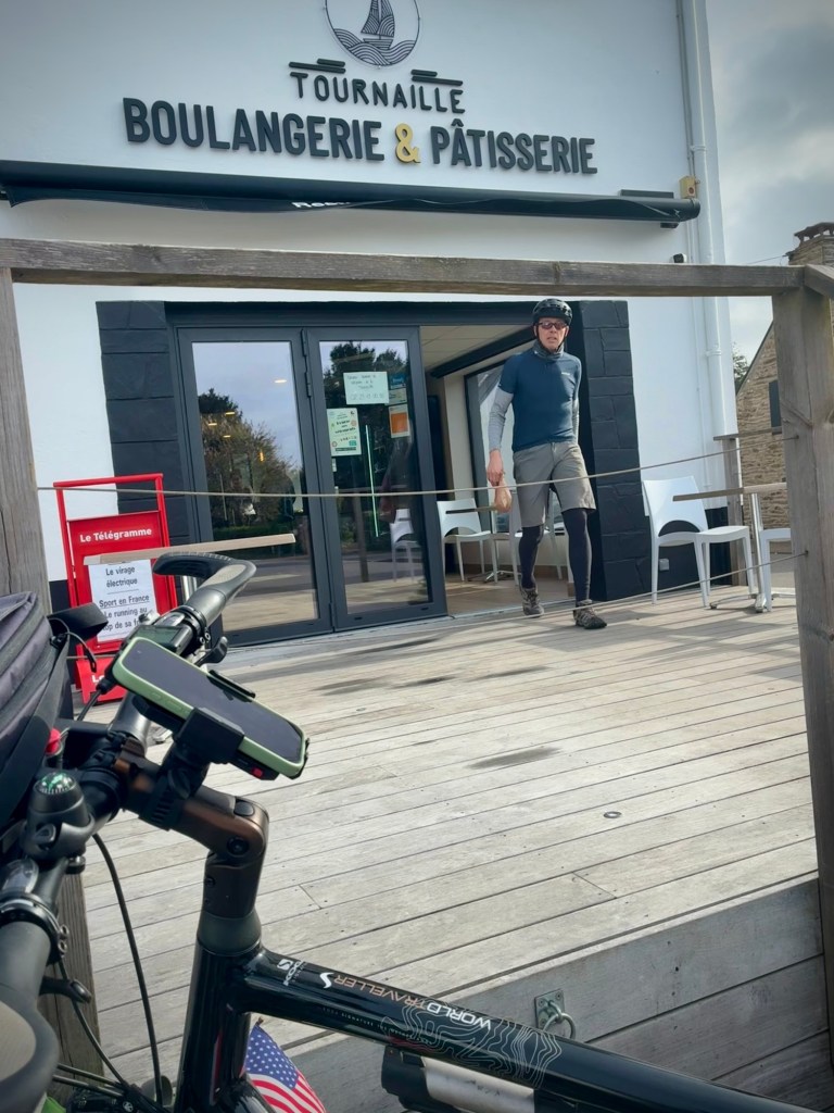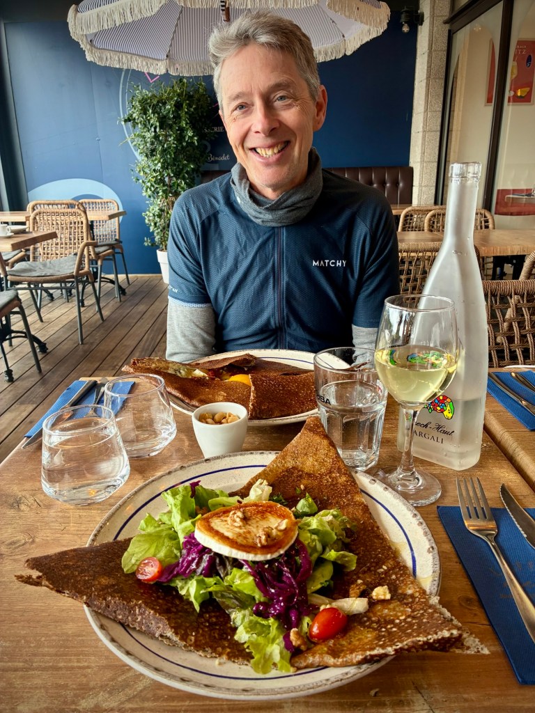 I was still on the mend, but the Boulangerie stop is still essential.The route swerved and weaved from dirt to pavement through a beautiful stretch of the Finistère coast.Every turn was a new view and perspective on this jagged coast.A lovely stretch of coast near Near Cap Coz. Here they did exactly the street treatment that Concarneau needed. Turn the two lane road road one way, and make a wide bike and walking space.Then through marshy backwaters with a ton of birdlife. (Cheryl’s intense look BTW)My intense look as the face actually matches how I felt… crampy and weak…but it was beautiful.Happy pastry break with a view.Smiling through adversity (really?!)It went from sun to wind to rain to all at once every 10 minutes or so. The weather can be crazy here at the ends of the continent.So as we approached Benodet, we decided it was now or never for lunch at 2:30p, so of course it was crepes, as they are everywhere here and a staple. Also, it’s pretty hard to get a bad crepe in Brittany, sort of like pizza in Naples.The lighthouse at Benodet. A very tidy town with lots of nice vacation homes and beautiful coastline.