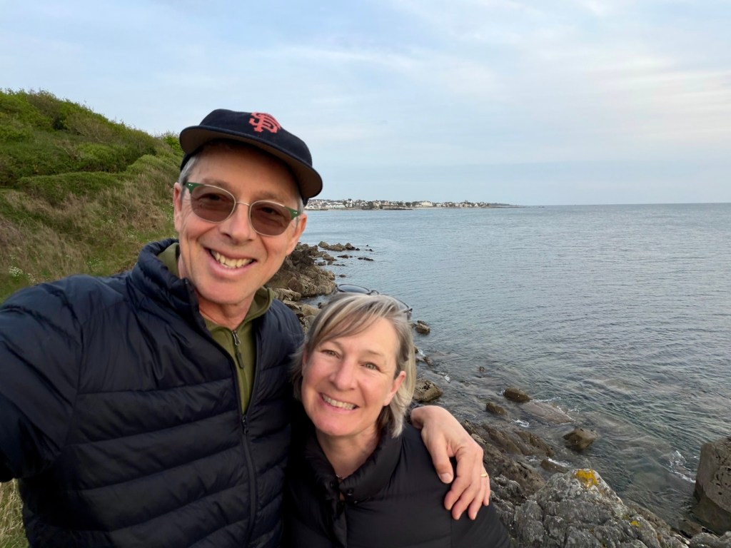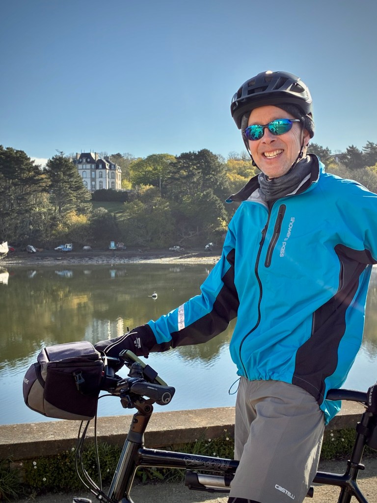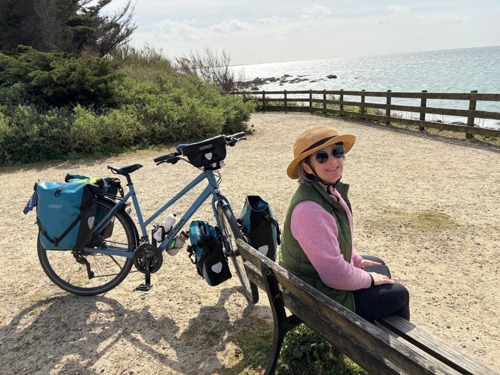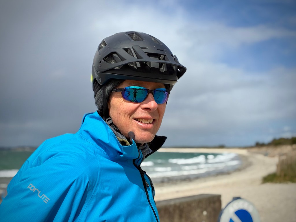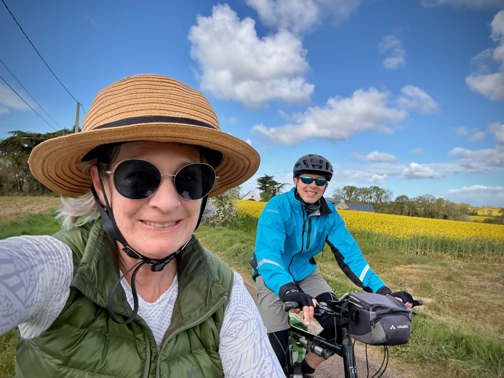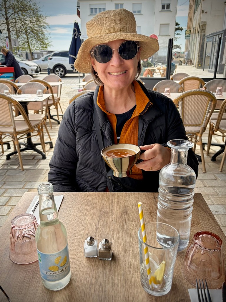 I was still on the mend, but the Boulangerie stop is still essential.The route swerved and weaved from dirt to pavement through a beautiful stretch of the Finistère coast.Every turn was a new view and perspective on this jagged coast.A lovely stretch of coast near Near Cap Coz. Here they did exactly the street treatment that Concarneau needed. Turn the two lane road road one way, and make a wide bike and walking space.Then through marshy backwaters with a ton of birdlife. (Cheryl’s intense look BTW)My intense look as the face actually matches how I felt… crampy and weak…but it was beautiful.Happy pastry break with a view.Smiling through adversity (really?!)It went from sun to wind to rain to all at once every 10 minutes or so. The weather can be crazy here at the ends of the continent.So as we approached Benodet, we decided it was now or never for lunch at 2:30p, so of course it was crepes, as they are everywhere here and a staple. Also, it’s pretty hard to get a bad crepe in Brittany, sort of like pizza in Naples.The lighthouse at Benodet. A very tidy town with lots of nice vacation homes and beautiful coastline.