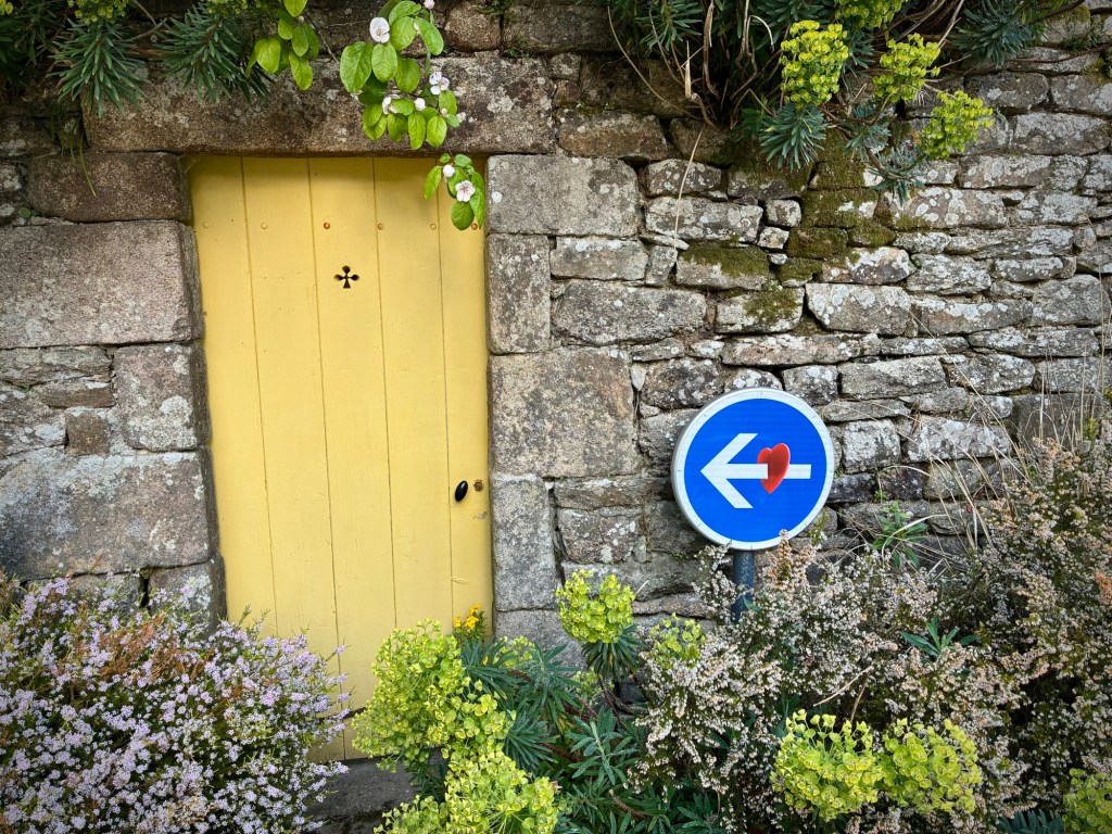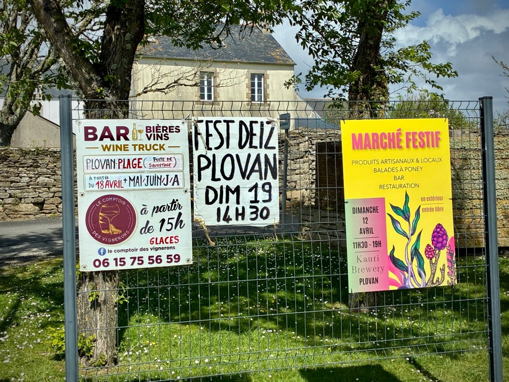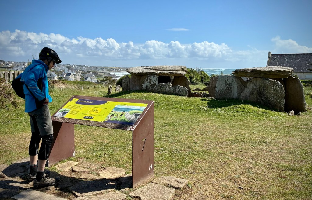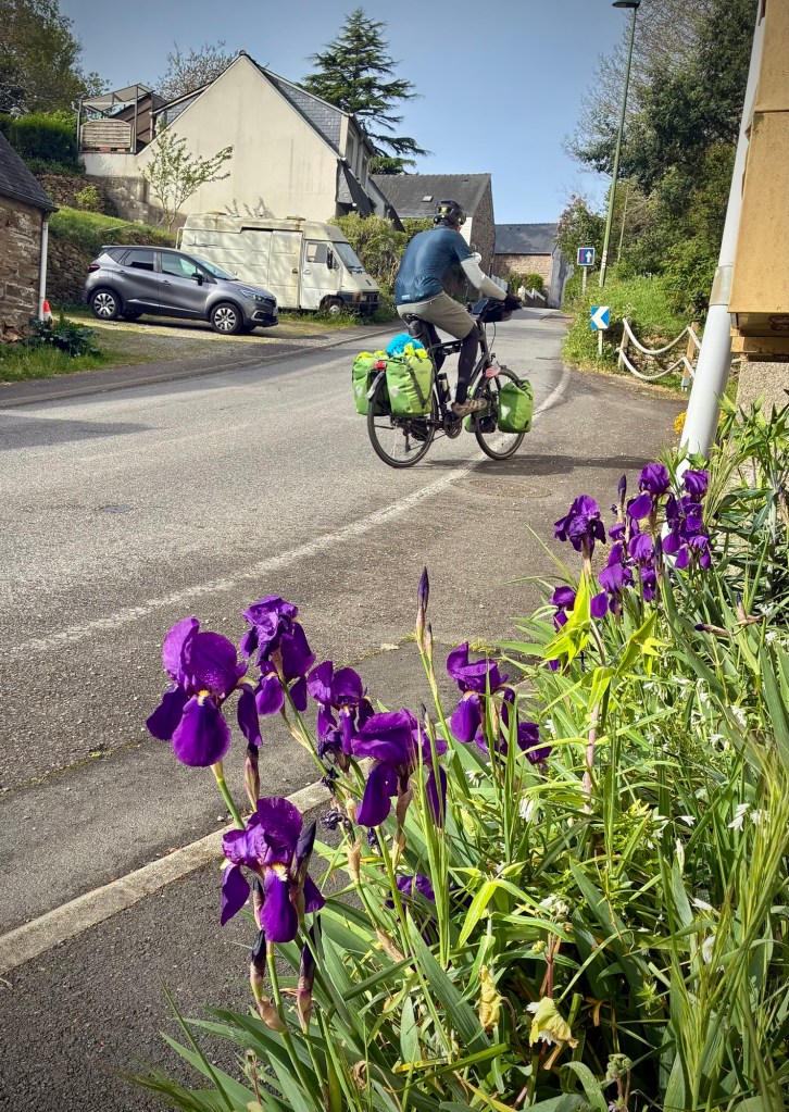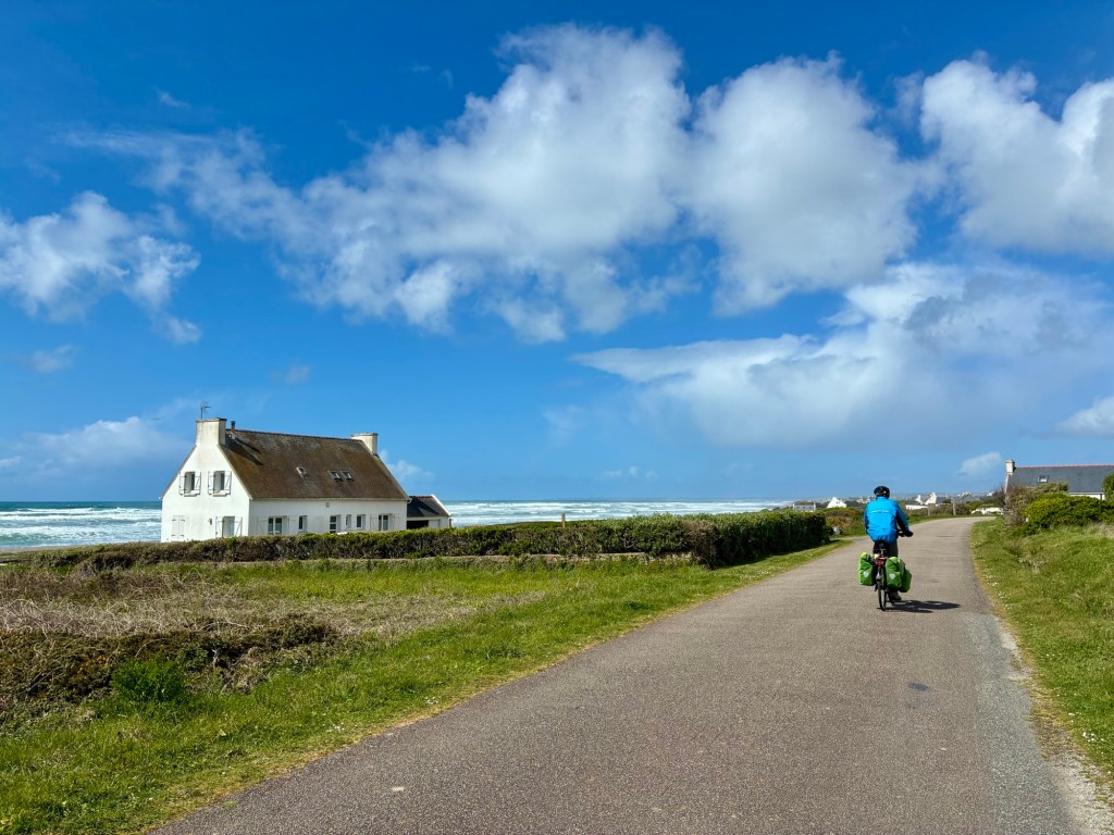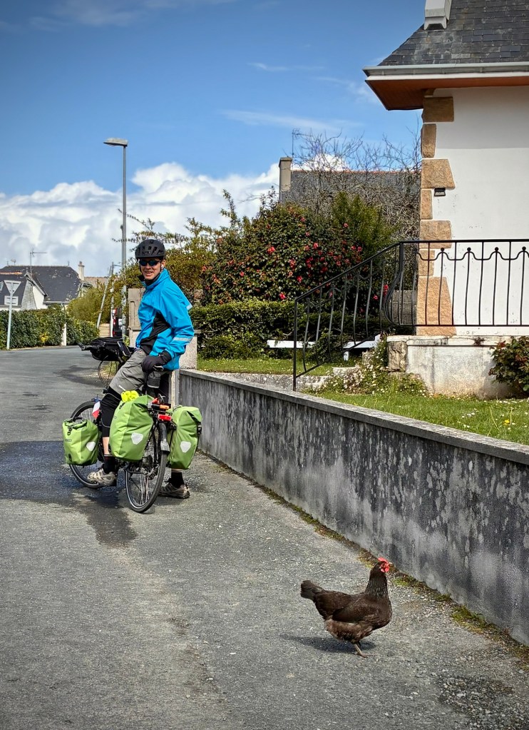 A few free range chickens crossing the road. We don’t know why.The ruins, sky, and sound of the crashing ocean in the distance is inspiring, and reminded us of Ireland…really not too far away and another Celtic culture.Inspired to pilgrimage Breton flags and language are ubiquitous. Many kids now attend bilingual schools in this area, keeping the language alive.Breton flag and typical ceremonial dress, which often varies even from village to village.Blue is the color of the region and buildings take a beating along the windswept coast.Spring marks the start of festival season and small local events. The Sunday Microbrasserie event was tempting as we passed within a km but a break is tough to get restarted from and my stomach probably didn’t need an afternoon beer!?The Bay’of Audierne is vast and exposed.Rows of breakers from strong west winds. We quickly realized why the more popular swimming beaches are in less exposed areas of Finistère.Neolithic sites are dotted throughout the region, including a cave indicating habitation over 400,000 years BP. Yes, you read that correctly. See the amazing Menez DréganThis dolmen is new compared to the cave site below on the coast and only dates back 2,000 to 4,500 years BP.These Neolithic burial sites still feel awe inspiring, and put today’s troubles in a bit of perspective. Time will pass and it will all be ok. Or it won’t. But time will pass.Up and down relentlessly as we approached Audierne.Destination reached! Another spectacular corner room over the beach at the friendly and nicely renovated TY YS Hotel in Audierne. Swing season is great.The light of Brittany is both soft and ephemeral.Rolling out of Audierne for the interior on another beautiful day.Audierne is built on a major inlet for protection and reminded us of Scandinavian ports such as Bergen.So psyched to be riding and digesting again!These small hearts on the road signs were unique