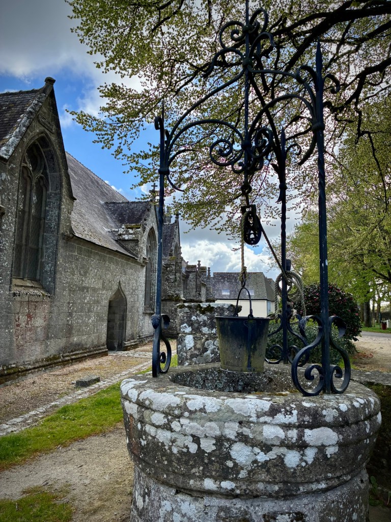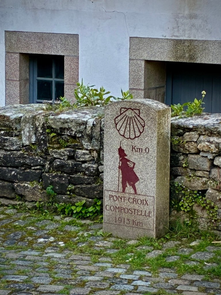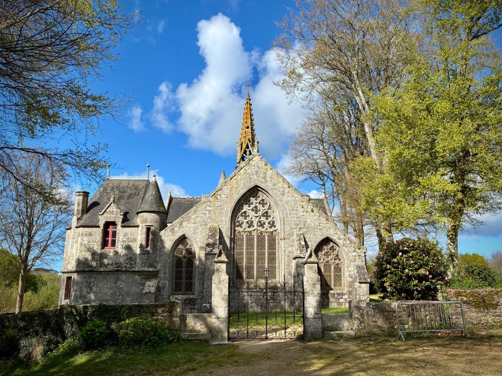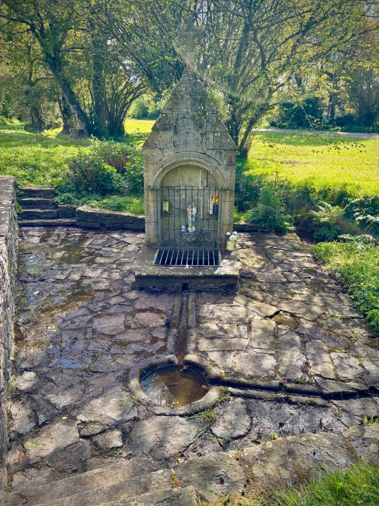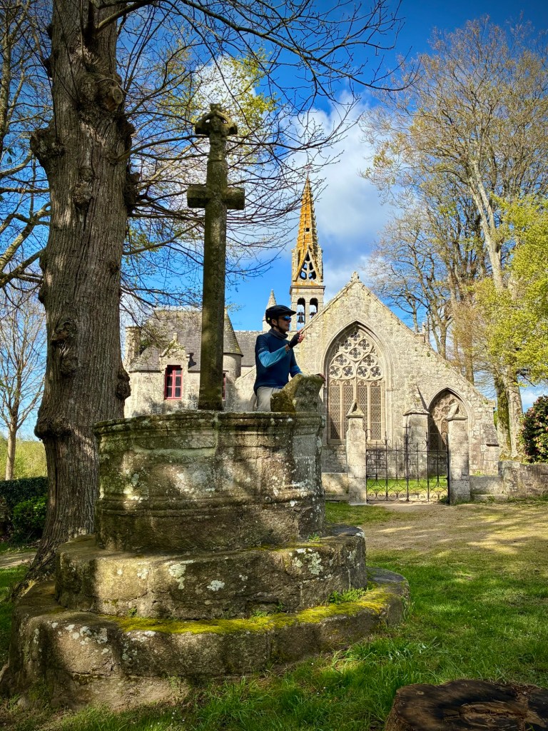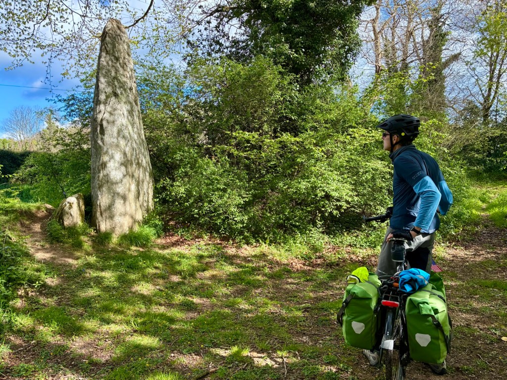 Heading up Le Goyen from Audierne. A spectacular morning. The tidal reach up the river is extensive.Finally heading upland towards Douarnenez.The architectural church style here is the “Pont Croix” and sure enough, you can walk all the way to Santiago de Compestela from here if you have a few months and good shoes.The beautiful Chapelle Notre-Dame-de-Kérinec, literally in the middle of nowhere. Why?Water was definitely a reason for this Chapels Location. Calvary cross and outdoor pulpit. Oh, and an access point to get up there….Apparently in the 1700s, the occasional Sunday Pardons (religious festivals) required an outdoor venue as crowds gathered from the countryside.Perhaps the spring was a draw here and motivation to build a church. It may also have been the drive to override the pagan Neolithic sites of the area.Speaking of Neolithic sites….Another cozy dolmen just down the road.And onto the Menhir with my spring camouflaged panniers!This is a big one.Big sky and sea.Oops, how’d this get here?