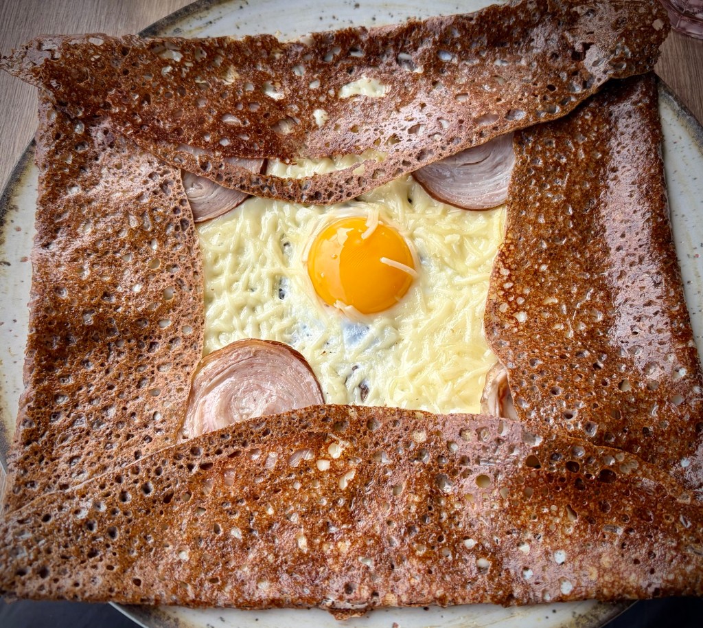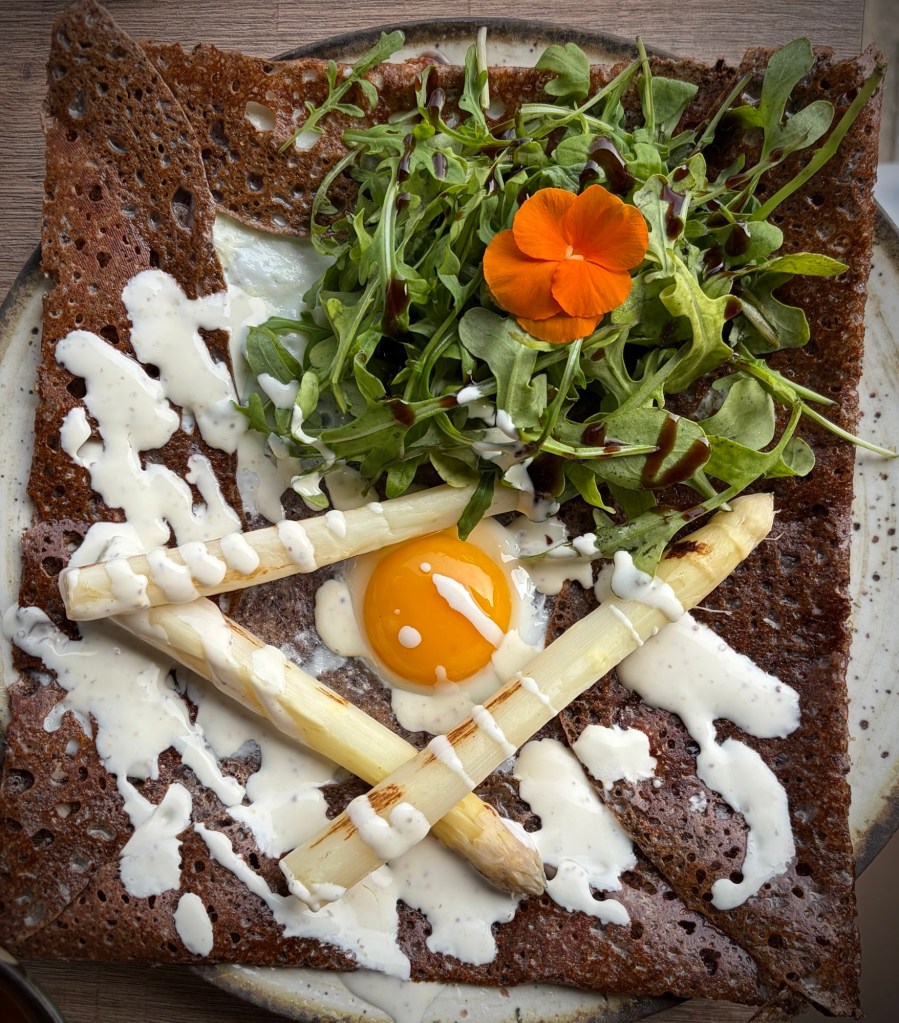 Cheryl loving the unique designs of every cidre “coupée” in Brittany, and the fact we were eating together again. Cheryl’s pick with spring white asparagus and even some greens!My choice of classic emmental, egg, and a touch of andouille sausage went down ok (and stayed down, yea!).