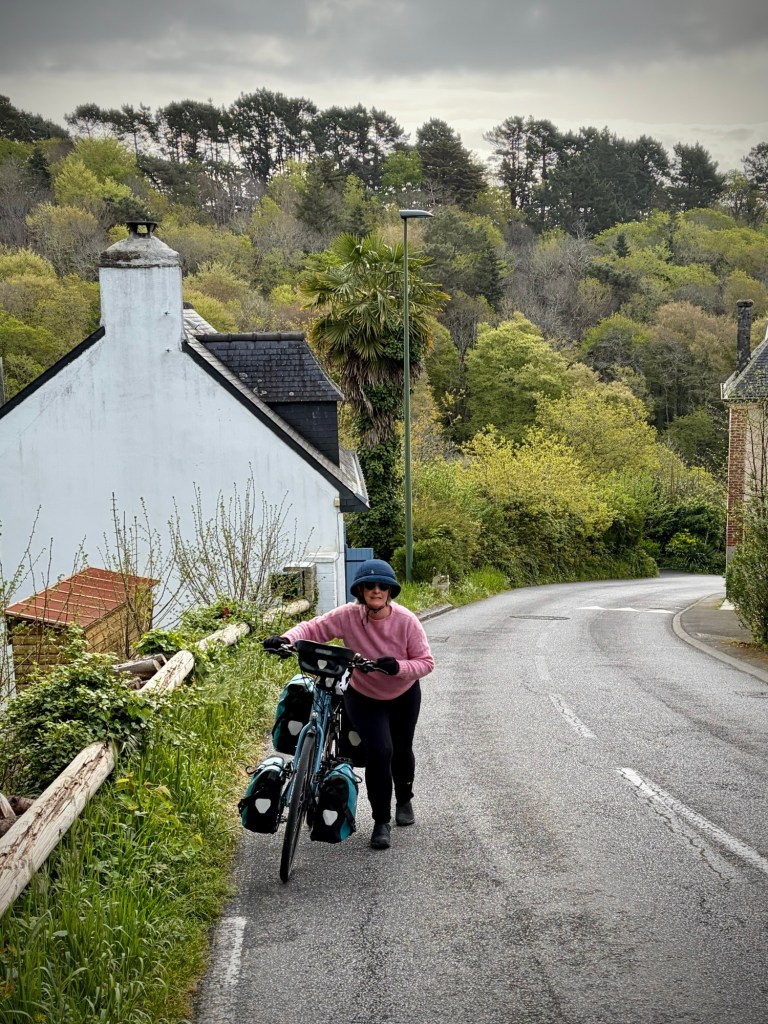 Swerving a bit to get up a 15-20% slope. I would pay for this early effort.Cheryl more sensibly hiking her bike up the same long grade out of Concarneau.