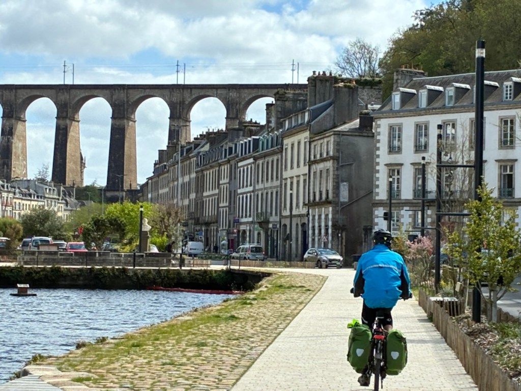 Riding into Morlaix. The viaduct above was built in 1865 and carries trains. It was only mildly damaged in 1943 bombing and repaired.