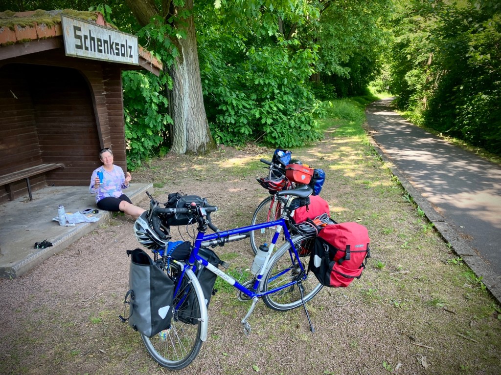 There were fewer smiles on a train hop day, when we ate lunch on the station platform hiding from the sun.Both the departure station and arrival station only had stairs, which meant unloading all panniers and carrying everything down and up: very few smiles.The train system in Germany is very good, but a lot of small local stations have only stairs.