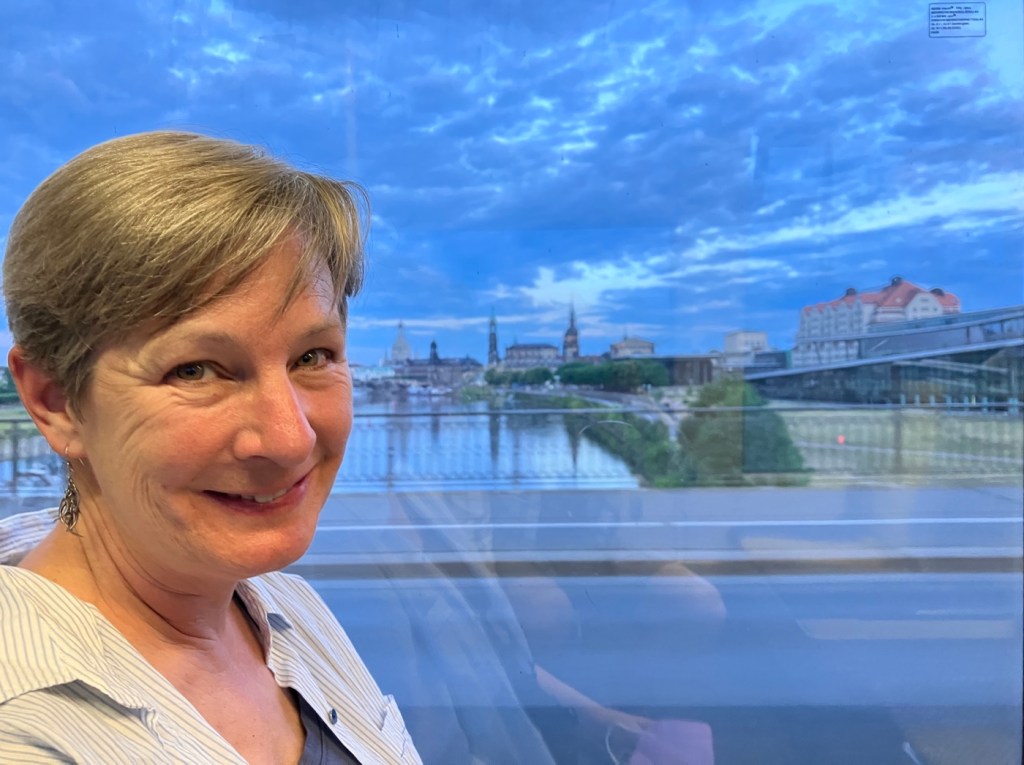 Cheryl reflecting sunset over the Elbe in Dresden. Both Leipzig and Dresden have extensive tram systems approaching 100 miles in length. Low boarding, fast, and free with our €9 monthly train ticket!
