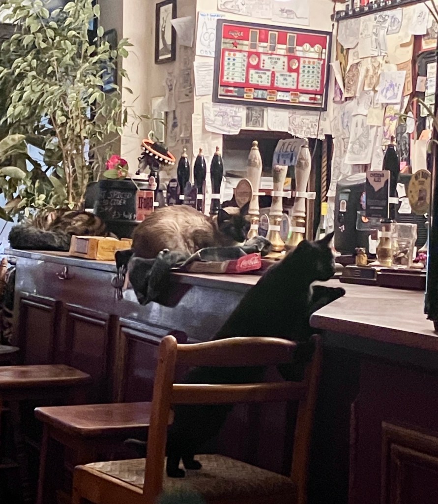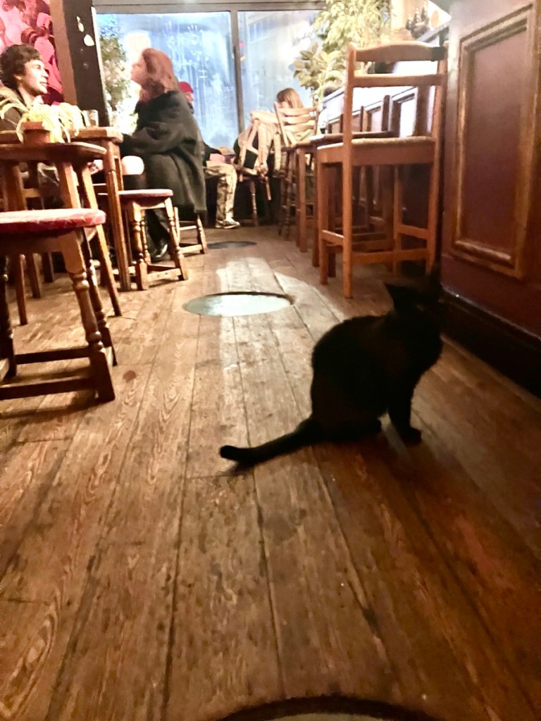 Bristol Temple Mead station. Plenty of bikes in Bristol.A swan and a view over the Floating Harbor, a lock controlled off shoot of the tidal River Avon created in 1809.Homages to Brunel are many in Bristol!The hydraulic equipment at Underfall Yard Visitor Centre, which explores and explains the elegant engineering behind the Floating Harbor, and its importance in the development of Bristol.Artsy shot out of the historic building.It wouldn’t be a trip to Bristol without a visit to a Banksy artwork.And, like a magnet pulling us in.The Bag O’Nails pub. My favorite pub. Another must visit place for us.The cats of the Bag O’Nails pub.Pub patrons trying to seem uninterested in the cats.The cats truly uninterested in the pub patrons.Just minding my own business by the record player.Gotcha! Lured in by my wool sweater and scarf and spot near the heater. I failed to look nonchalant when this cat graced me with their presence.The Left Handed Giant pub, another favorite of ours.Sometimes it was also a bit cold inside the pubs.The ceiling of The Cornubia pub. Horse brasses and beer mats. Yes, a lot of pub visits.It was not cold inside the Cornubia. My favorite pub fire so far. Clean burning coal. Wood fires not allowed in that area, the bartender said, but clean burning coal is ok.We took the train to Bath to go for a walk in the hills.The Bath Skyline Trail.A break on a well placed bench.Snow hanging on thanks to the cold weather.
