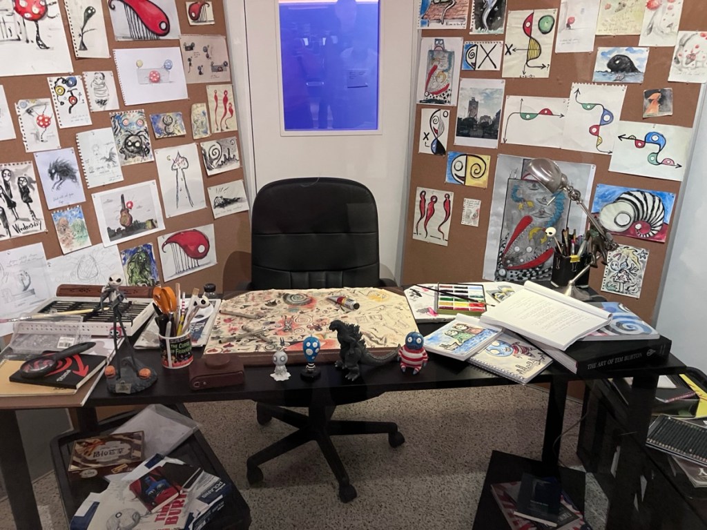 Recreated office, the desk blotter doodles were fantastic.I wasn’t aware what a talented artist he is.Obligatory selfie set up.Many of the movie sets and costumes had signs not to photograph them. This Nightmare before Christmas-esque mobil and wallpaper had no such sign.