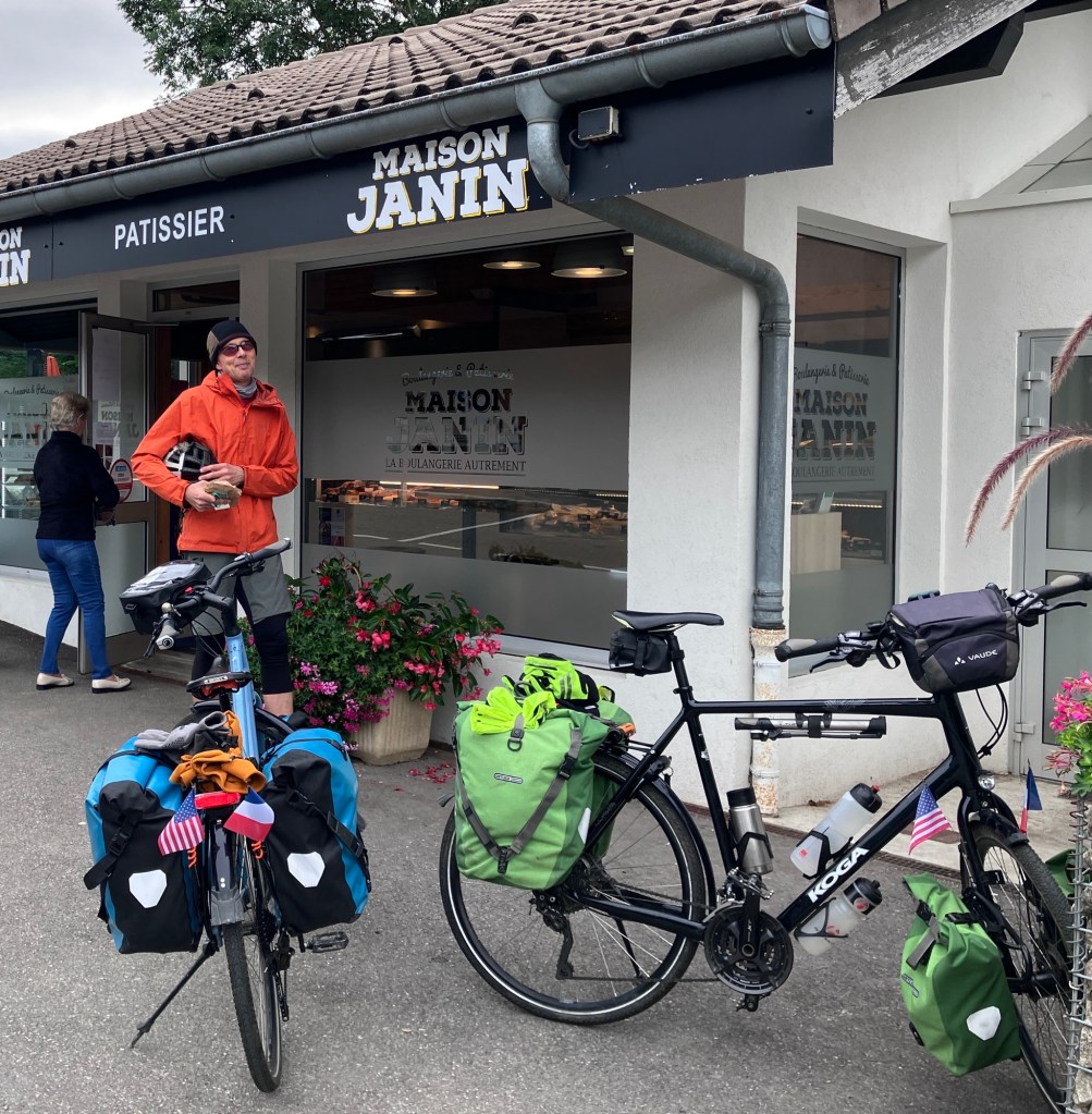 Heading out of the Vallée Verte, France. And into a cool and wet weather pattern.First stop: Boulangerie. On to Switzerland.Even more fun when you ride a fantastic bikeway from France into Switzerland.