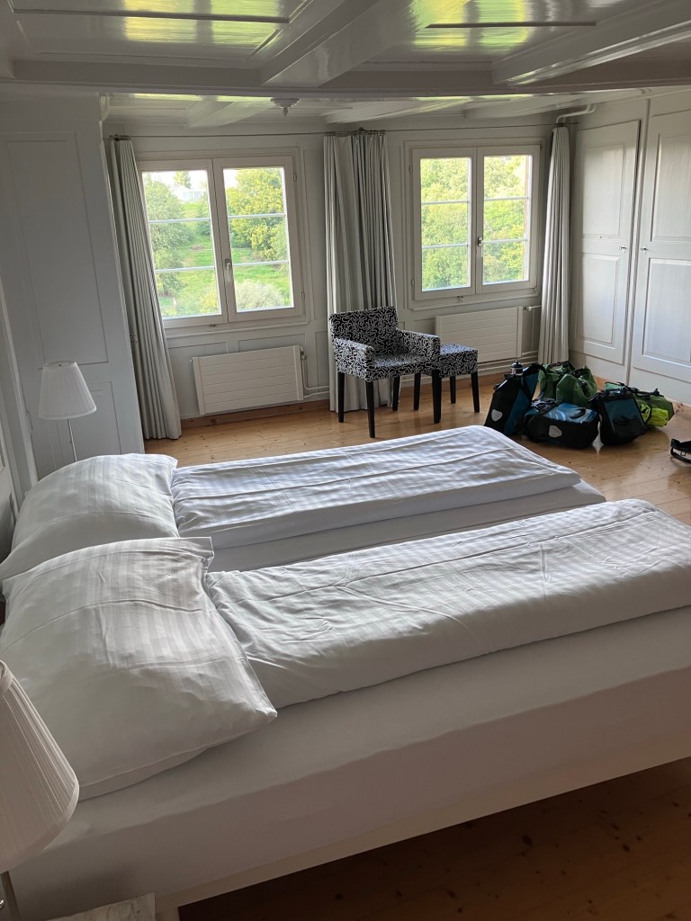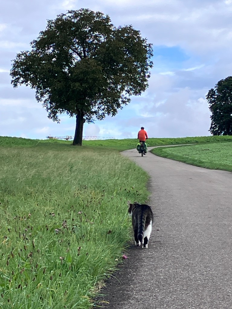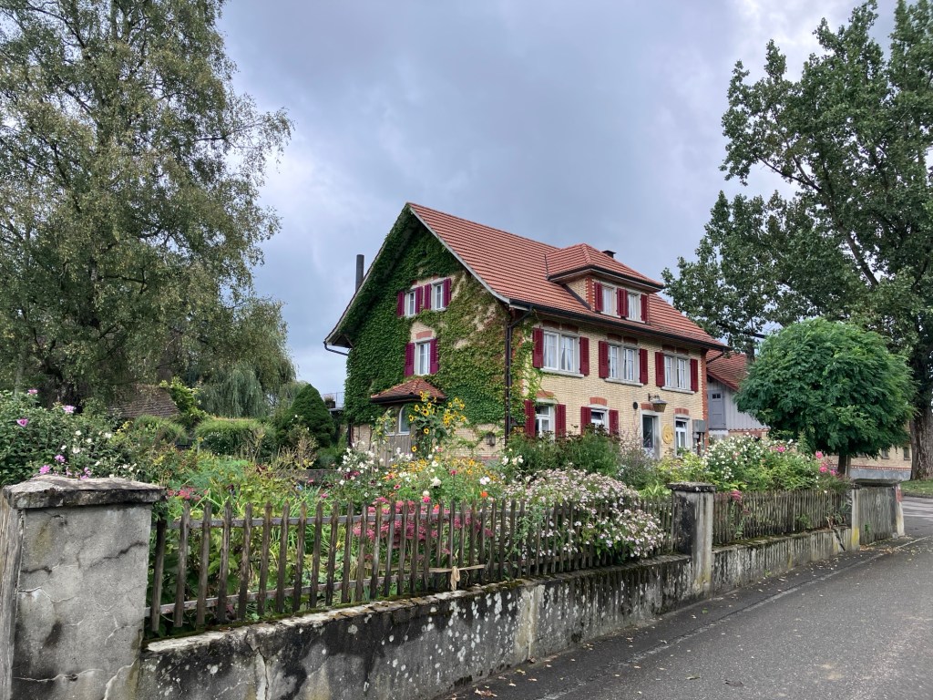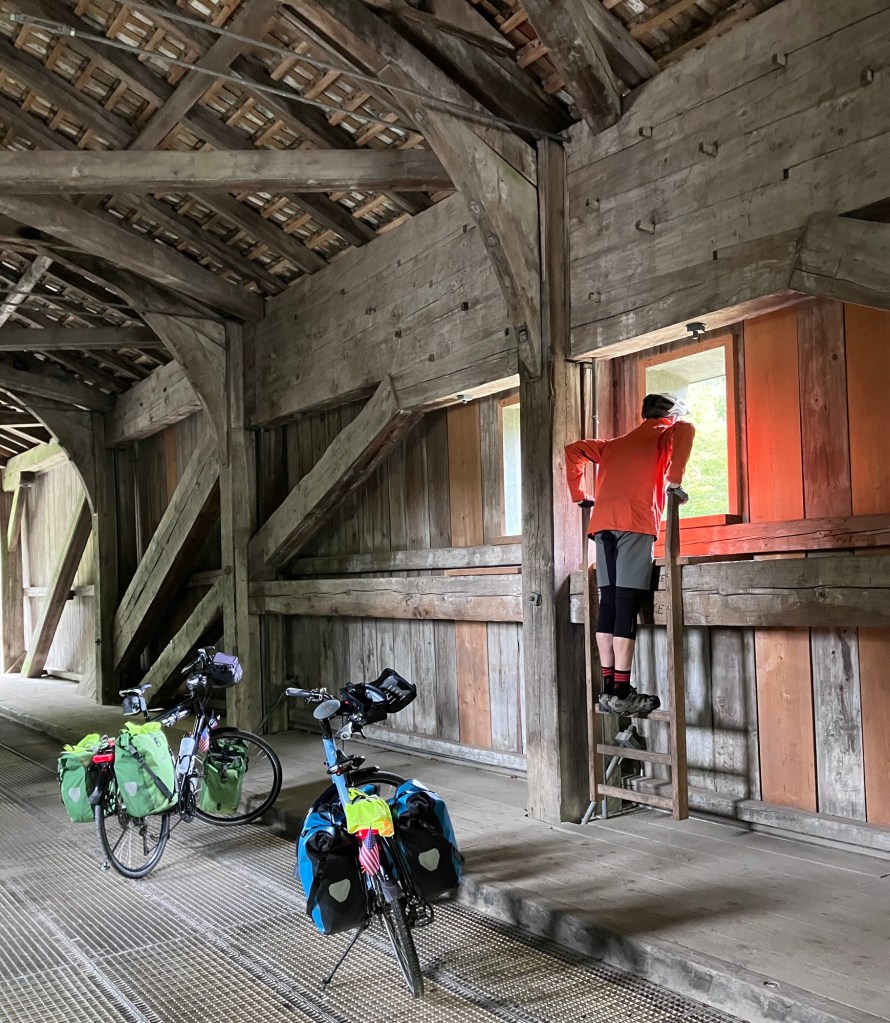 Usually the farm cats are too far away or too skittish for photos, but this one came over for a visit.And then started following Rich up the road.Covered bridge! This covered bridge had windows and ladders so you could admire the view.Some cow barns have automatic scratchers which start turning when the cow leans into the brush.I’m sure the locals and farmers laugh to see us snapping photos of their farmyard animals, but who can resist chickens wearing feathered footies?Smooth smooth asphalt on the bike paths.Apple season! There are so many apple trees. Well tended orchards and random trail side trees. We only pick apples from those which are not obviously part of someone’s orchard.Gardens are still blooming. Our lovely historic room in Wil. This is before we dumped the contents of our panniers everywhere.The view over Wil from our hotel. The clouds are so dramatic.