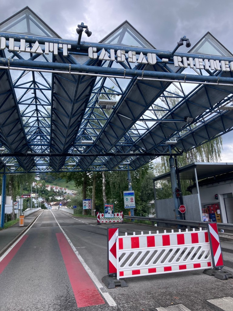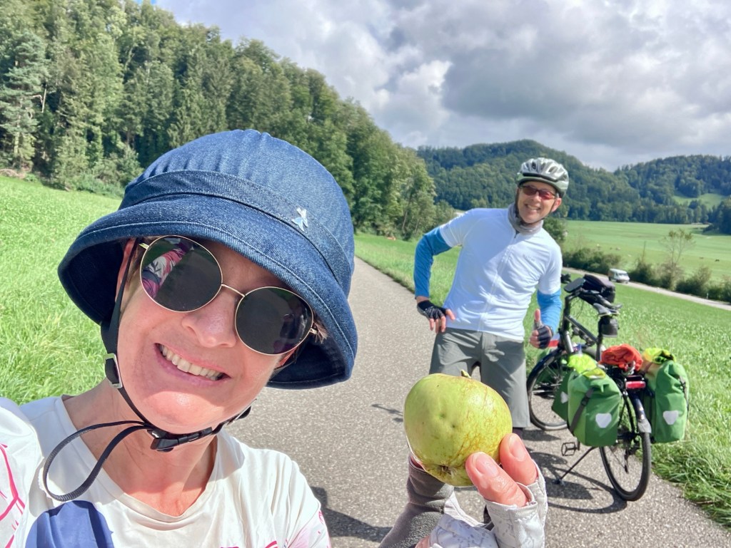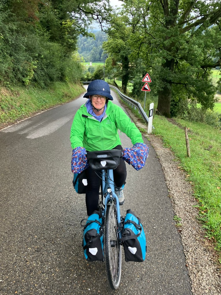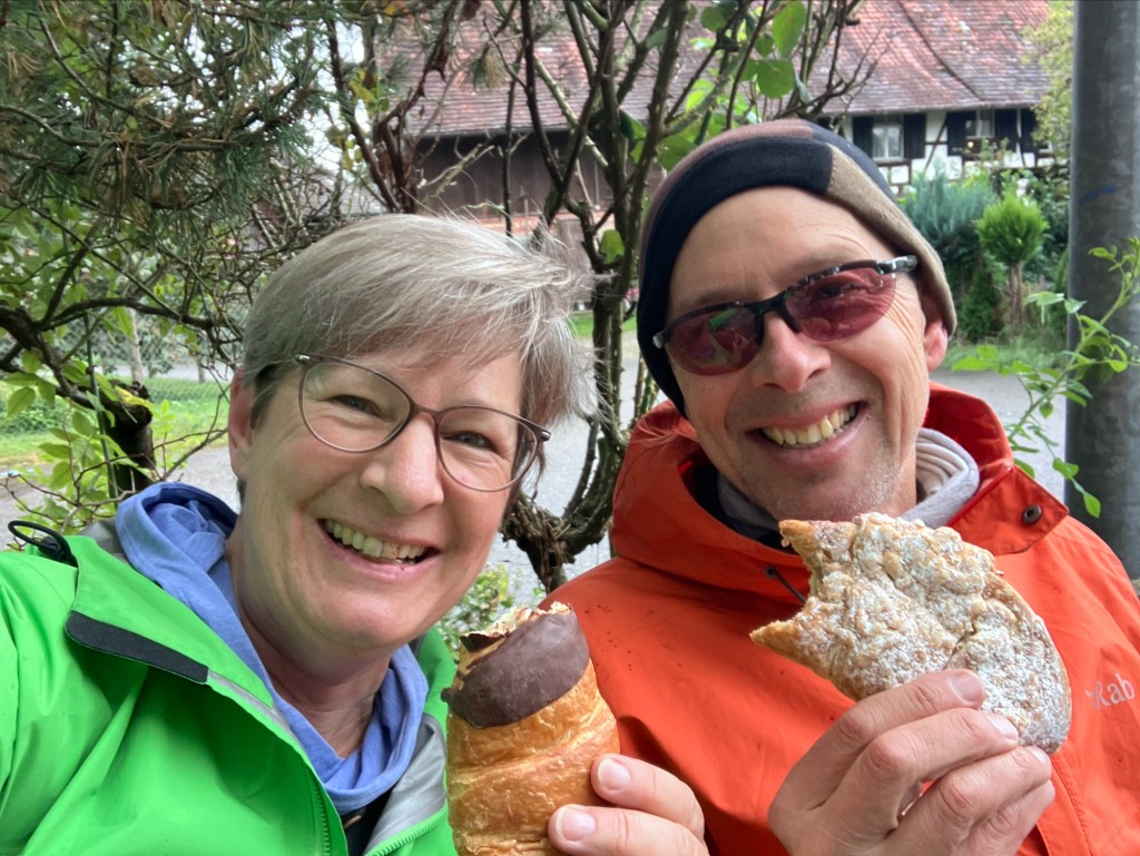 Heading out after our second and last night in Switzerland. It was a cold morning.What’s the first stop? A bakery. Always.No, this giant cookie did not come with us.Another covered bridge.Apple trees so loaded that their limbs are propped up.More apple trees. And threatening skies.The villages, all centered around a farm, are so charming.And welcoming. With benches and a fountain. A perfect place for a pastry break. And then the rain came down.And a very nice woman across the street invited us to shelter under her barn overhang. Climbing up, we’re almost out of Switzerland now, about to cross into Austria. My handle bar covers are still working well. Keeping my hands warm and dry.Beautiful Swiss cows wondering why we are leaving Switzerland. The signage makes you feel so welcome as a cyclist or hiker.Schloss Hagenwil. We went inside and had a look around. Mostly restaurant space but quite stunning.The chapel. Hagenwil is the only intact water castle remaining in Eastern Switzerland. Imagine what it took to build and maintain this castle.Lake Constance to the Swiss and Austrians or Bodensee to the Germans. Attention Cats! Or Danger Cats!?A train crossing. That’s an Austrian train. We’re so close!Wait! How did we get on this side of the border already? We’re in Austria after crossing a little bike pedestrian bridge.To refresh your Austrian geography, here is a map. The little left side tail which touches the lake is where we entered. That’s Lake Constance.Our one night in Austria would be in Hard, and we were both quite impressed with the space for bikes and pedestrians on this bridge into town. The engineer said “Now that’s how you build a bike lane on a bridge.” Yes, we’re looking at you West Span SF Oakland Bay Bridge.Another pristine hotel room. Before bag explosion. As a bonus, it started to hail just after we checked in. This early and cold storm, named Boris, will dump snow on the Alps and cause flooding in Czechia and Austria. We are fine though.Another cold and wet day. I’m clutching my tea thermos which is extra swaddled to keep it warm. And a bag of pastries.My favorite: quark tasha. Like a cheese danish. And a photo bombing Rich.