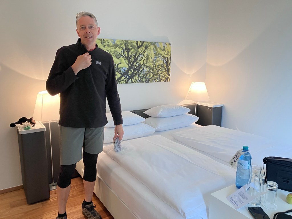 Dueling train lunch decisions. Gazpacho for me, not Rich’s favorite.Smoked trout for Rich, not my favorite.We stopped outside the train station in Zürich to put on all of our rain gear and started the 10k ride to our hotel.Any dry spot in a storm is welcome.