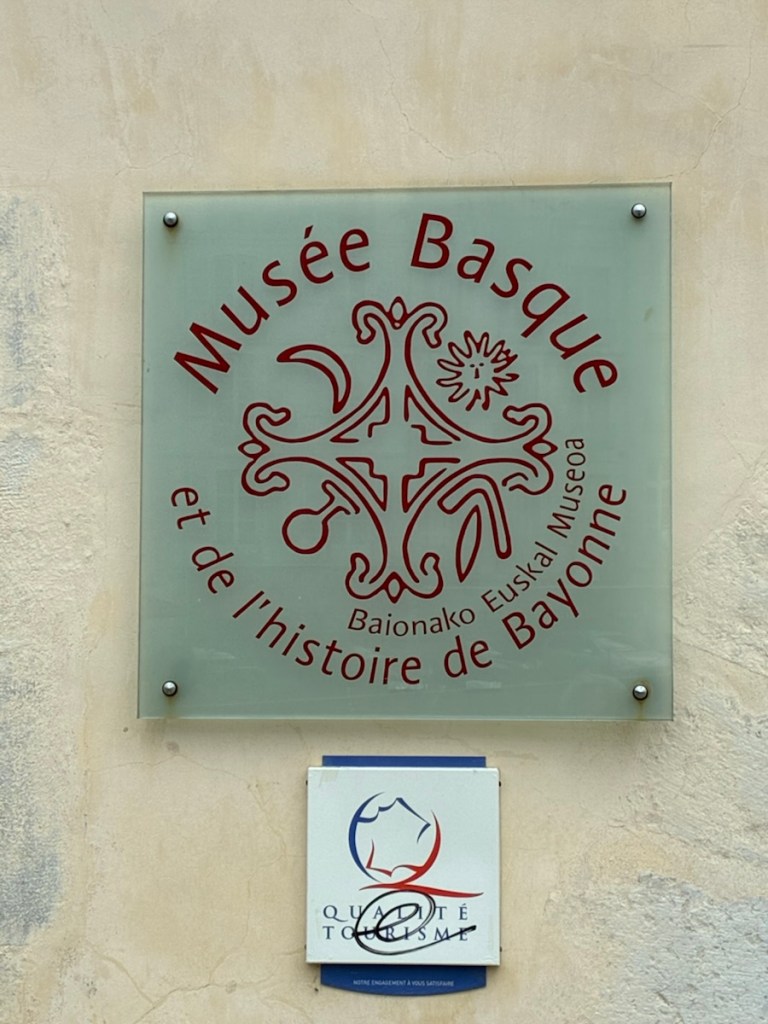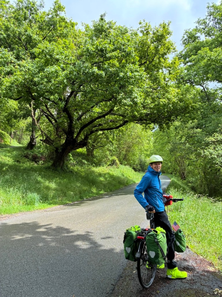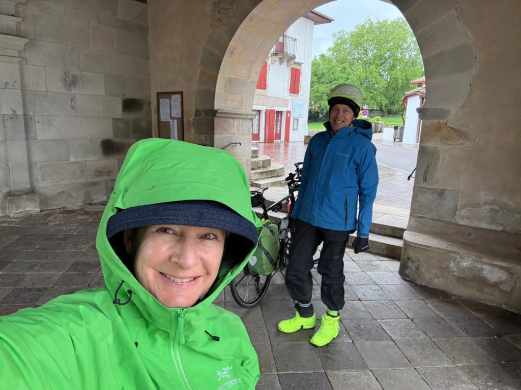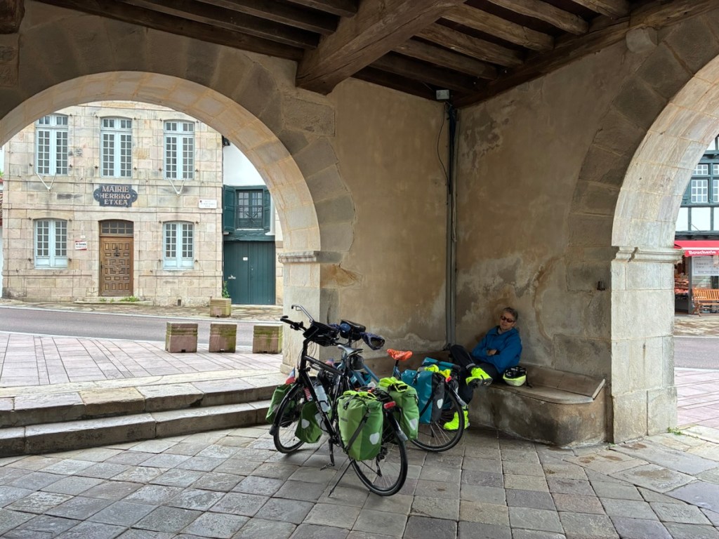 Hiding from the rain in the vestibule of a Church in Ascain. Rich went inside and told me I had to go in to see the cool wooden balconies.It is a traditional Basque church. Église Notre-Dame-de-l’Assomption de Ascain. The wooden galleries were new to us. We later learned in the Basque museum in Bayonne that they were added to accommodate the increase of population, and so women and men could sit separately. I imagine there was much making eyes and flirting going on across the way.Seafaring was an important part of Basque life. I love the model ship with its wee Basque flag.Churches with covered porticos are much appreciated. But, time to leave the church and head up another hill. With another helpful/motivational sign. 5% grade. This was the second segment after a starting 7% pitch.We topped the climb and the sun welcomed us to the downhill.Whee! Pay no attention to those big grey clouds.Focus instead on these fascinating stone fences. Walls? Enclosures?Flat stones lined up one after another.Whoops. While we were focused on the stone fences the clouds had their way.The little stand across the square was selling Gâteau Basque.The houses had a look to them in this French Basque area, the Pays Basque.White render (a surface coating), half timbered, and trim and shutters in the emblematic Basque red or green. The carved stone lintel usually tells the story of who first lived in the house when it was built, this one in 1662.Blue shutters and wisteria. This is in Ainhoa where we spent the night in what we shall always refer to as “dead mouse room”. No body was found but the smell was pretty recognizable. Staff was apologetic and thankful we didn’t pitch a fit. Eh, we said, old buildings have their challenges. We left the window open, they comped us wine.Stone fence AND a 1670 lintel stone! Pays Basque bingo anyone?Not many photos on this rainy Sunday. We’re trying to get to Bayonne in time to visit the museum of Basque History.Riding down the Nive River to Bayonne.Fragments of the old town walls still exist.Rich demonstrates how narrow some Bayonne buildings are – just about a Rich and a 1/2, about nine feet wide.We made it to the museum. So much information. If you don’t speak or read French it’s a bit of work to figure it all out, but worthwhile. A really picturesque town, and very lively.More bits of the ancient walls.And one of the few towers still standing. This was the executioner’s tower, now a private residence.The Nive river is running fast and high from all the rain.Narrow streets in old town.Bayonne in the sunset light.Looking down the Nive, towards the confluence with the Adour River.The look of a cyclist who knows she has a long day ahead of her. At least no rain! And we’re off riding out of Bayonne.Into the scrubby forests of the Atlantic coast.And the wide sandy beaches of the Capbreton area. We are still on the Bay of Biscay.Sand dunes and blue sky. A welcome change.Still smiling. Long day and headwinds haven’t gotten us down yet.