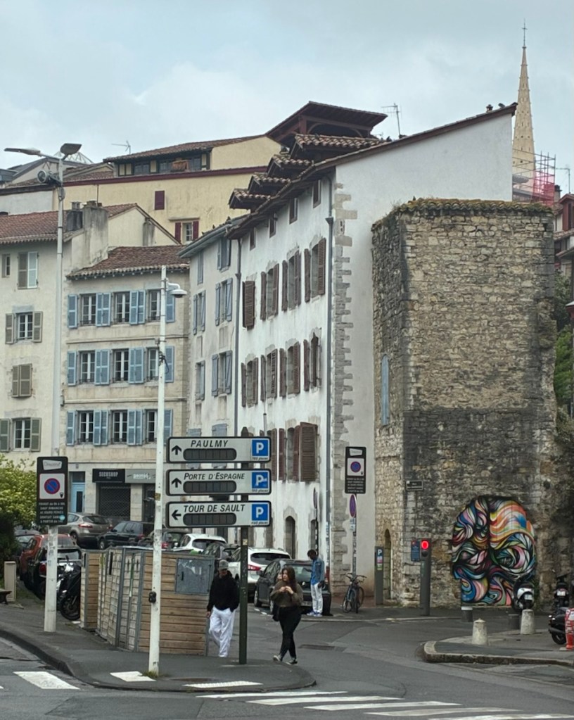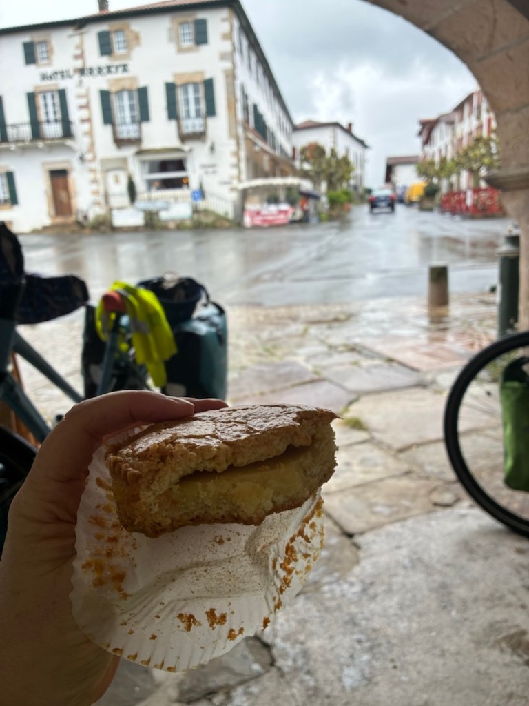 We knew the weather was changing. And boy did it! We woke in Saint-Jean-de-Luz to heavy rain. Nothing to be done but put on rain gear and hit the road. It was Saturday am and the hotel rooms that were available in this beach town were quite expensive, so on we went after a one night stay. A quick stop at the grocery store for lunch food and I did stop myself from buying espadrilles from the colorful display inside the Carrafour City grocery store, but only just. Absolutely no room in the bags for another pair of shoes.