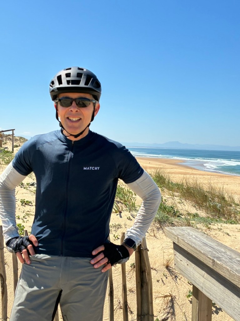 And this is what I was wearing. Pink flowery top and a straw hat helmet cover. Sandals. Sun gloves. Hilarious. Rich waiting, not at the summit yet, but up the worst of the climb.At the summit. The view back to San Sebastián. Saucy riders! What a beautiful day we got. Rich and the summit sign. King of the Mountain! That’s my downhill face. Big smile.I like the signs put up to inform cyclists how steep the road is. Motivational?Mountain bikers, road cyclist, and faint words on the asphalt from the Clásica San Sebastián road race.A shade break at the Hermitage of Guadalupe. Familiar to us from our Camino which started in Irun, just down the mountain.Down we go.Rich points to France!Across Etorbideko Zubia, the bridge over the Bidasoa River, the border with France.We give the nod to France over Spain for bike infrastructure. But Spain wins for super nice cyclists and considerate car drivers. Hendaye, a sunny day at the beach before the storm blowing in. Still fascinated by these sheep.And how cute is that lamb?Over another hill. Coming into Ciboure, the town before Saint-Jean-de-Luz where we’ll spend the night.More beach goers. It’s a Friday and this weather is not going to last much longer.The happy travelers overlooking the Grande Plage of Saint-Jean-de-Luz. Our Basque horseshoe. The blue dot is us in France again. We’re actually still in Basque territory, French Basque.Celebrating with pizza right before the wind blew in. All the other outdoor diners headed inside. The next day’s ride will be a bit wetter.