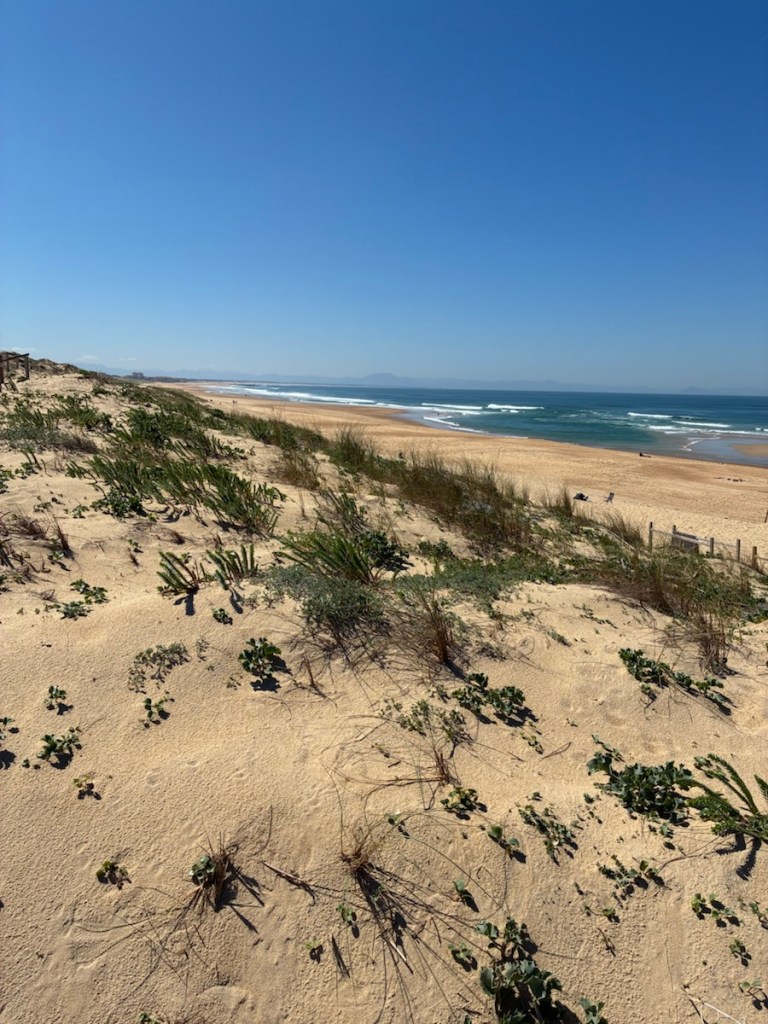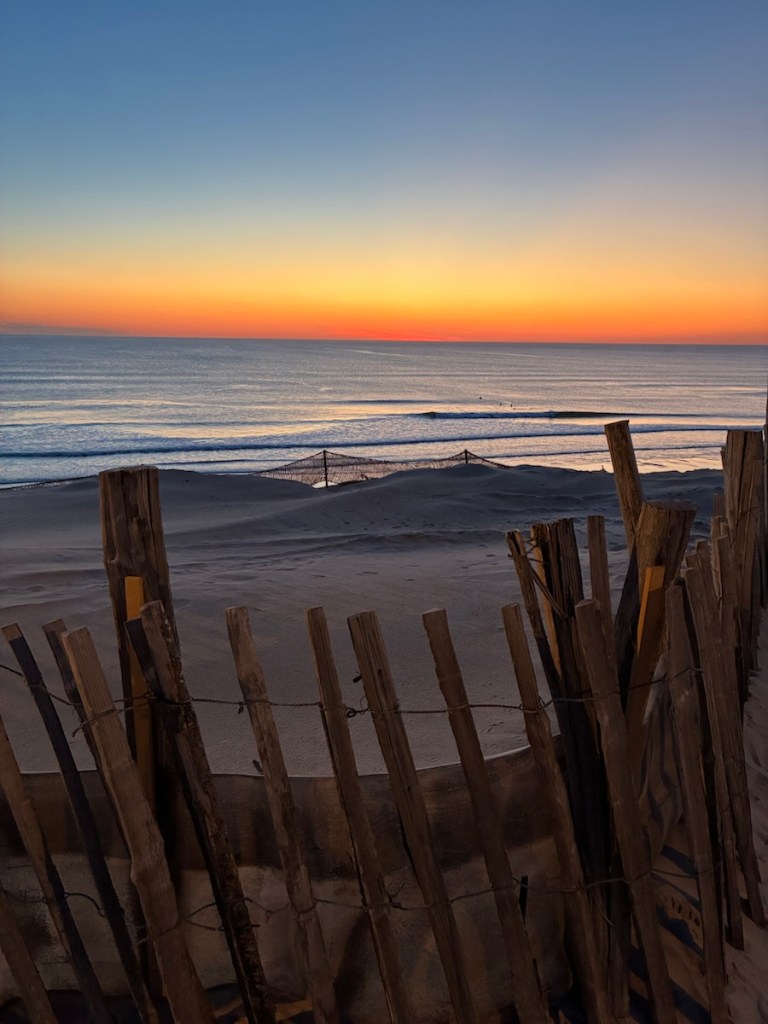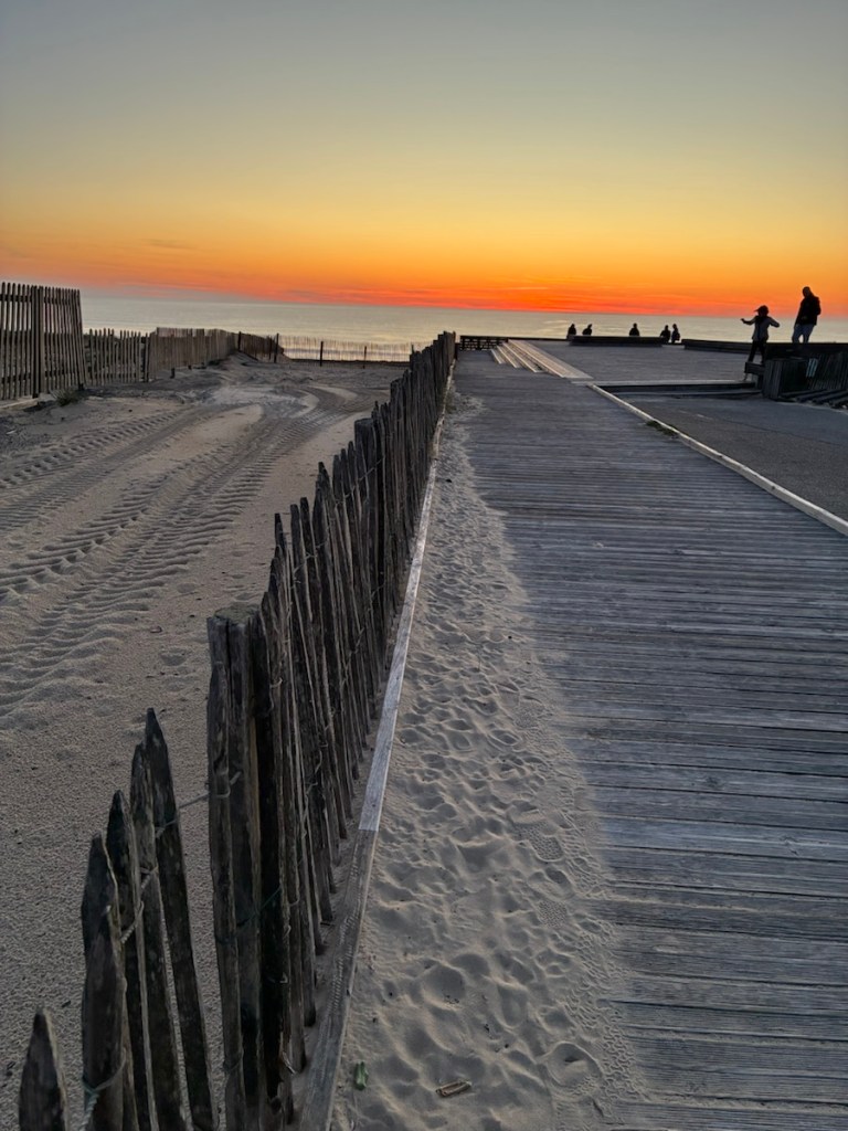 It was a lot of this. But at least the weather was nice! We made it! Giddy with relief and post shower. 90k/55m later. Contis les Bains and our long shadows on the beach at 8pm.The main drag down to the beach is packed with folks and noticeably car free. Space for restaurant and bar tables instead of parking.The Contis Lighthouse.If you weren’t on the Main Street you were up on the dune watching the sunset.Sunset, happy humans, and a weathered fence.And the next day we’re off again.