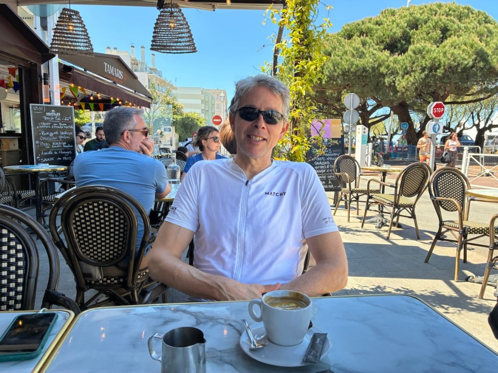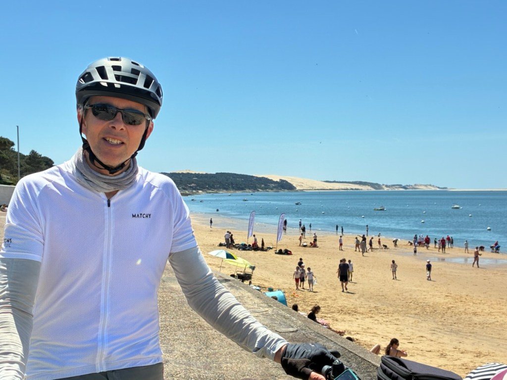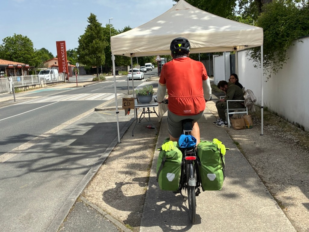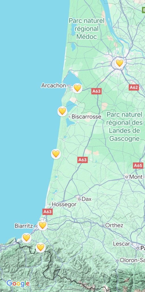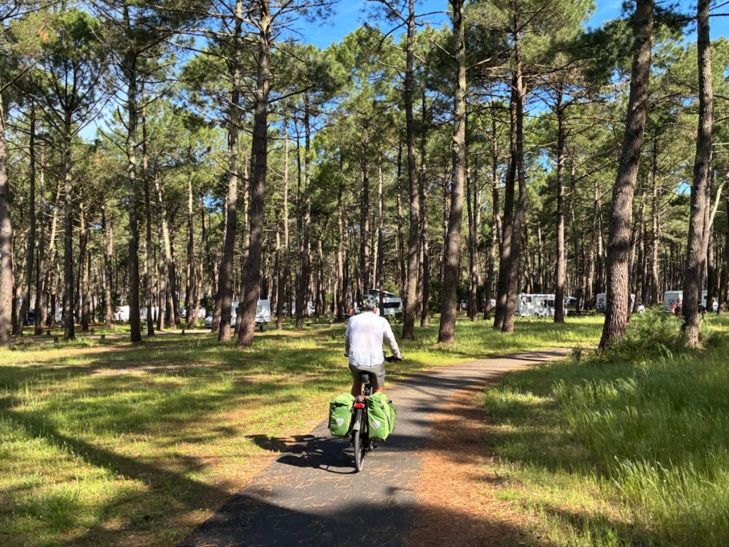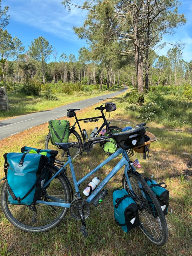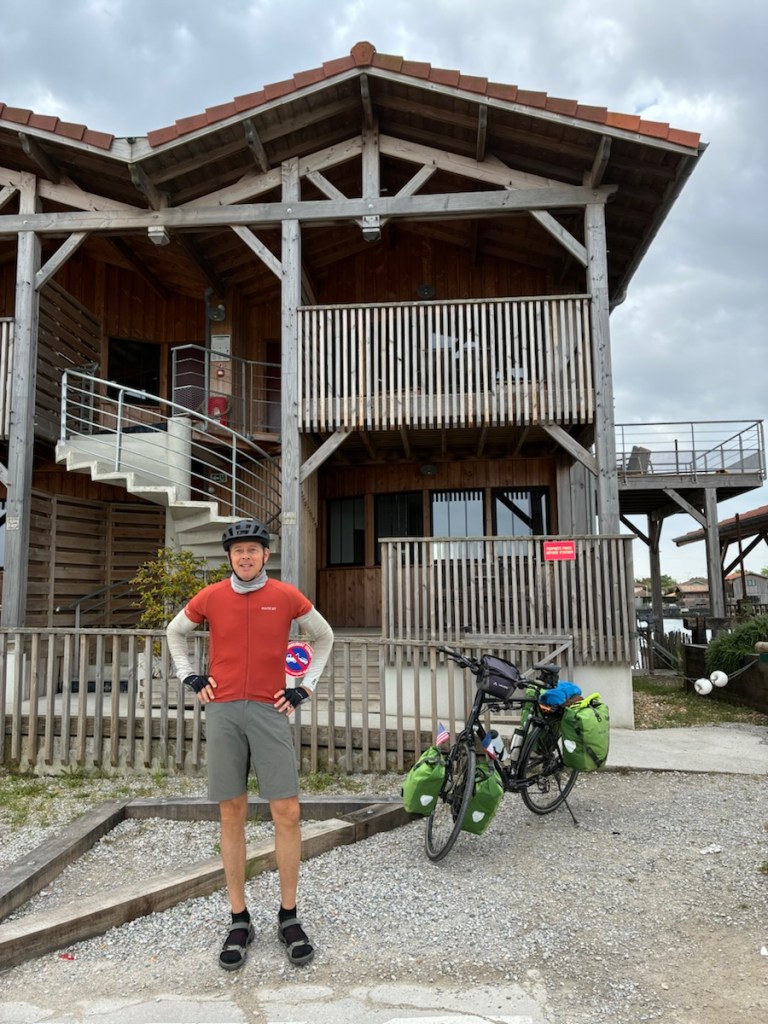 More Atlantic coast scrubby pine forest riding. This long stretch of bike path was just a dream. Lovely pavement, nice swooping curves.Take a break. At the grocery store. Big shaded entrance so why not relax?Riding by one of the lakes of Biscarrosse.The sunsets! Biscarrosse Plage where we spent the night.Breakfast fuel up for another day riding.The campgrounds were filling up on this Wednesday, April 30th. Folks ready for the May Day holiday.The terrain is about to change. Giant sand dunes! Folks practicing paragliding.Dune du Pilat in the background. Happy beach goers and a slightly cranky cyclist – this part of the coast is getting very busy. A long weekend and nice weather means lots of people out.Pour some more coffee in him! That might help. And tea for me. We’re in Arcachon, very close to where we will spend the night.The beach stretches were fascinating. Boardwalks and such a mix of old and new buildings.