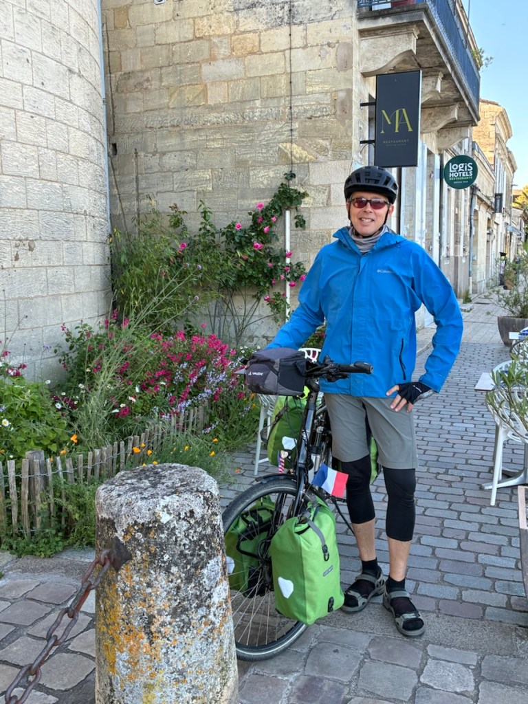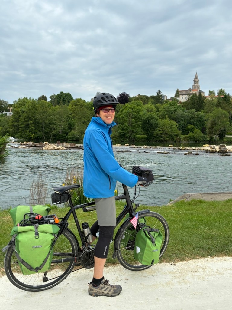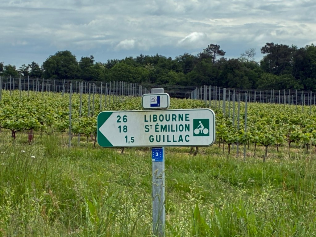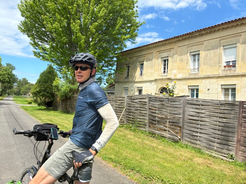 Repurposed rail lines are fascinating. Imagine all the wine that went through this tunnel.We are firmly in the Bordeaux wine region now.Buttery yellow stones and blue shutters.Wildflowers galore.The wine industry has created wealth for so long.Happily rolling along, looking for a lunch spot. We’re carrying our little chairs but it’s nice to find a bench with a view.A quiet riverside road in Branne, along the Dordogne River.Better know a French river, the Dordogne. 118 km long.More local yellow limestone buildings. And Rich.I love that this little dirt road has a name: Chemin des Grandes Bayches.Pastoral bliss and dramatic clouds. Getting close to Saint-Émilion, a very famous wine town.Which wine chateaux is this? No idea, but it’s sure pretty.The town of Saint-Émilion. Beneath that lovely skyline heaves a mass of tourists on this Sunday of open chateaux. Actually, it was only awful if you were trying to park a car. On bikes it was fine.We didn’t stay in Saint-Émilion, too busy. We headed to Libourne. On a bend of the Dordogne and at the confluence with the Isle River.