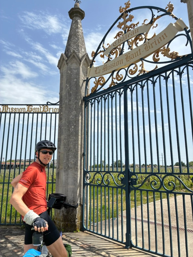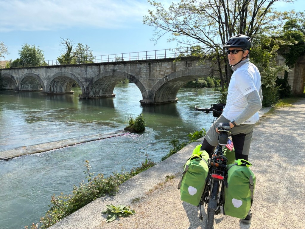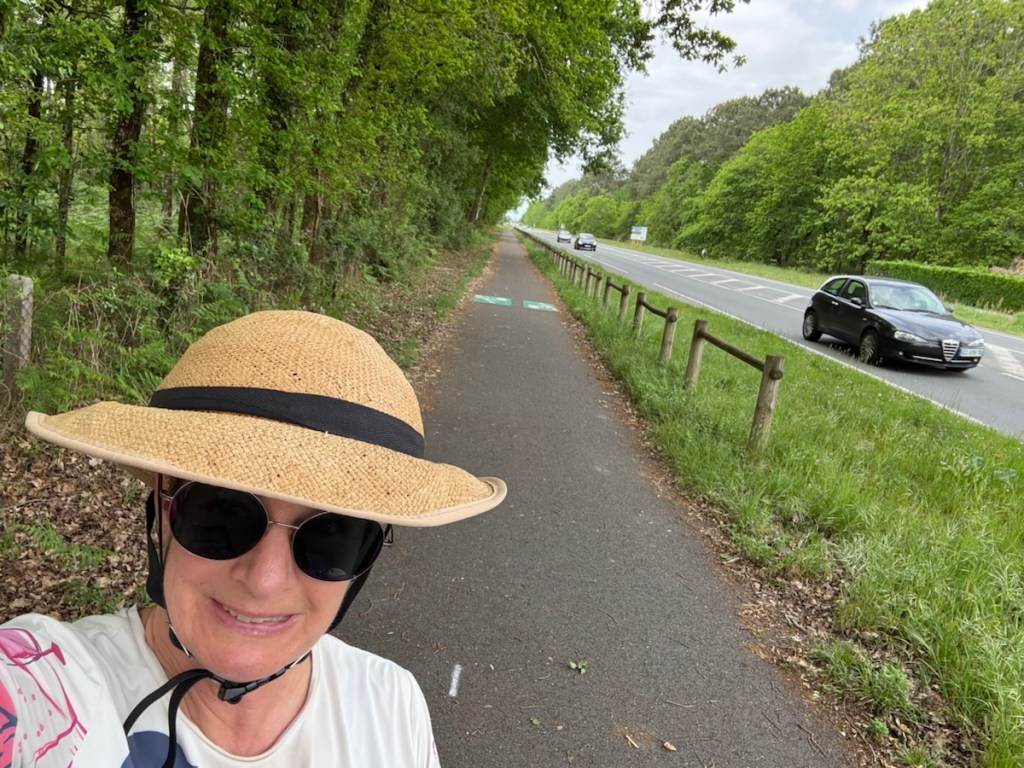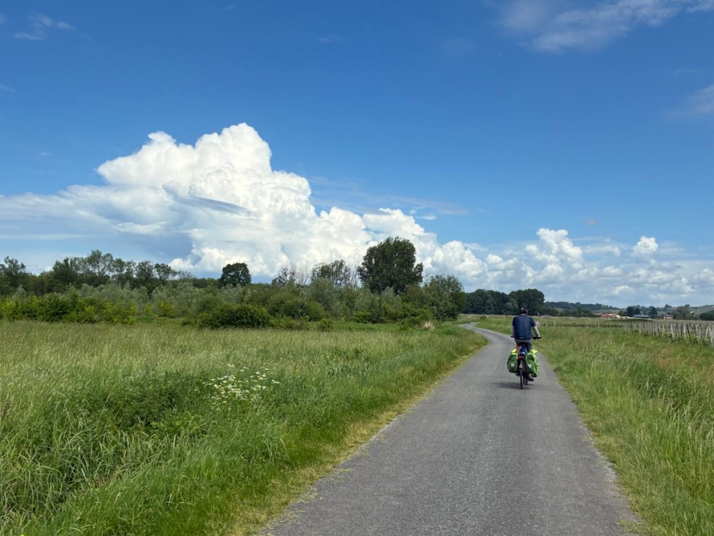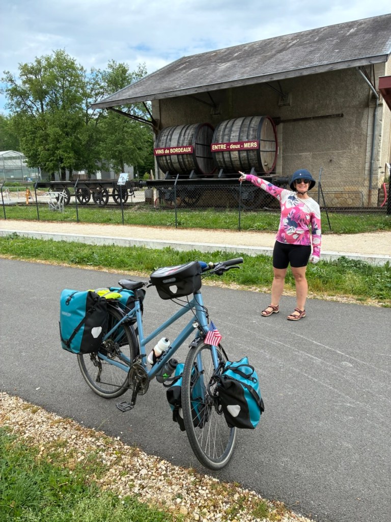 Repurposed rail lines are fascinating. Imagine all the wine that went through this tunnel.We are firmly in the Bordeaux wine region now.Buttery yellow stones and blue shutters.Wildflowers galore.The wine industry has created wealth for so long.Happily rolling along, looking for a lunch spot. We’re carrying our little chairs but it’s nice to find a bench with a view.A quiet riverside road in Branne, along the Dordogne River.Better know a French river, the Dordogne. 118 km long.More local yellow limestone buildings. And Rich.I love that this little dirt road has a name: Chemin des Grandes Bayches.Pastoral bliss and dramatic clouds. Getting close to Saint-Émilion, a very famous wine town.Which wine chateaux is this? No idea, but it’s sure pretty.The town of Saint-Émilion. Beneath that lovely skyline heaves a mass of tourists on this Sunday of open chateaux. Actually, it was only awful if you were trying to park a car. On bikes it was fine.We didn’t stay in Saint-Émilion, too busy. We headed to Libourne. On a bend of the Dordogne and at the confluence with the Isle River.