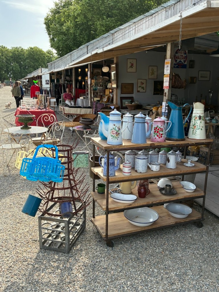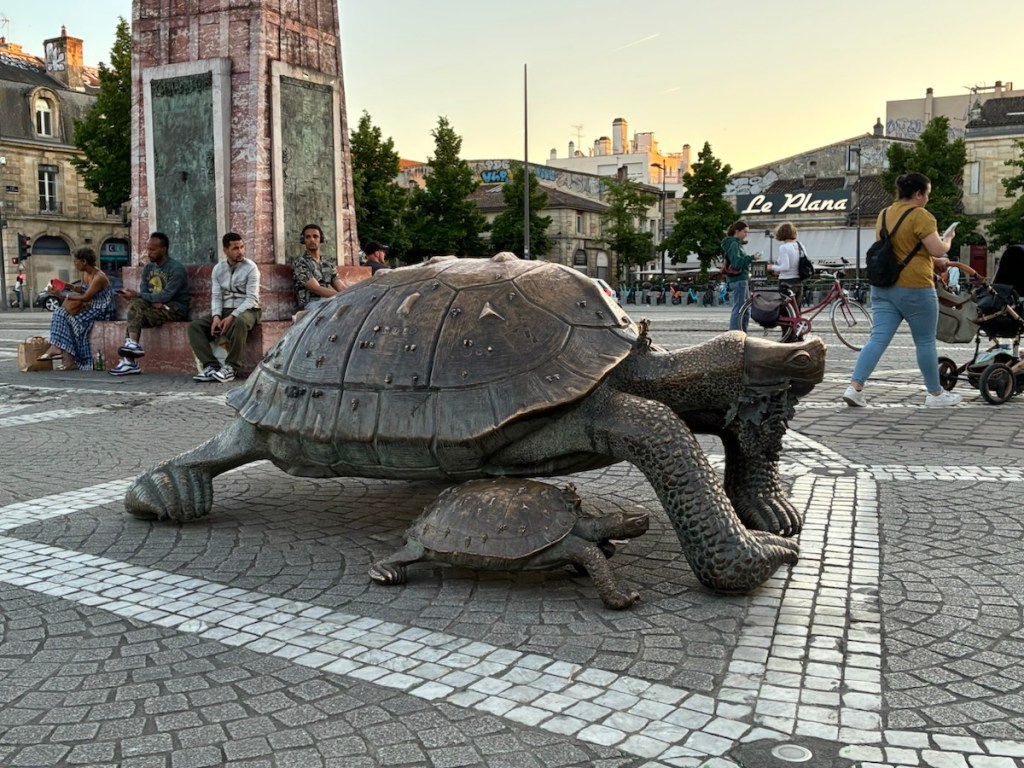 The oyster cabins. They serve oysters and wine. That’s it. The potholes in the dirt path are filled in the oyster shells.One of the seven ports of Gujan-MestrasA friendly cat helped us enjoy the sunset.On the jetty looking back towards the town.Celebrating the night before the May Day holiday. The barbecue is raging. Couldn’t tell if they were barbecuing oysters or other seafood. Or hamburgers.Tools of the trade.So many oyster shells. In most areas they are returned to the water to give the larvae of the next generation somewhere to hold on.Kitty showed up again to drink at the doggie bar.Port Larros, farewell.We’re off to Bordeaux for a much needed break. Three nights! We expected this road, Avenue de La Cotê d’Argon (D1250), to be an unfriendly bike route. But look! New cycle path! Not all the way but along a lot of it.May Day is a workers’ holiday, like Labor Day in the US, but way more widely celebrated. Little posies of Lilly of the Valley are sold at small road side stands. La Fête du Muguet (Lilly of the Valley Day).Why? In 1561 King Charles IX of France was given a posey of Lilly of the valley flowers as a present on May 1, and a tradition was born.Vineyards just outside Bordeaux. We hear they have good wine here? Who’s a good boy checking into the hotel? And sporting the French dog collar du moment – very wide. A huge bricolage, or flea market. I’d call it an antique market. Book a container and ship it all home…oh wait, we don’t have a home! Chicken pitchers!A bottle drying rack and enamel ware pitchers.Rich checking prices on bottle drying racks. Bassins des Lumières, a WW2 German constructed submarine base now a light show exhibit.Place de la Victoire has two stunning creations by Czech sculptor Ivan Theime to celebrate the culture of wine.First, the mama and baby tortoises. Rich added for scale. I didn’t realize how lucky we were to get a photo free of other people- ok, kids. Mama tortoise is eating grapes.And she is festooned with little figures, also holding or wearing grapes.The red marble obelisk, same sculptor. Makes an imposing focal point to go with the more whimsical tortoises.Since returning to France. The top heart is Bordeaux. We had seven days of riding, which explains why we were so tired when we got to Bordeaux.The tired happy travelers enjoying a tram ride in Bordeaux.