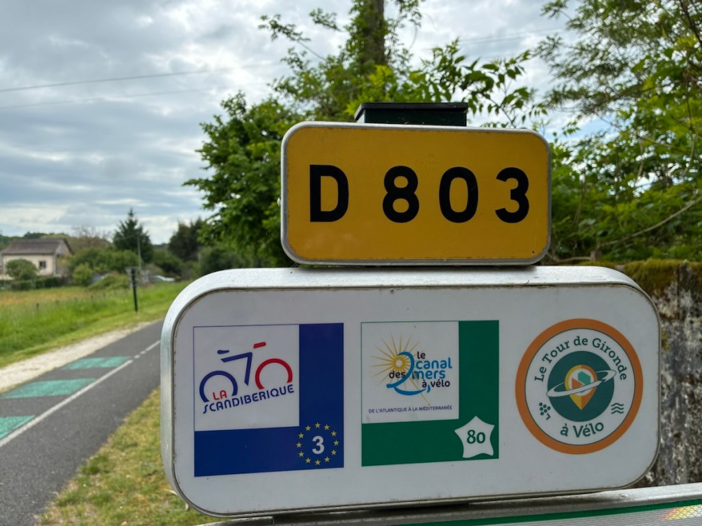 Now that’s a bike lane on a bridge! And so much pedestrian space to the left. Pont Simone Veil crossing the Garonne River leaving Bordeaux.The first information sign of the day.Three routes converge on a partially sunny day; Eurovelo 3 is international, Route 80 is a French National Route and the last is a local route.Giant wine casks! 7,000 liters each.“Twin-foudre wagons. Built in the late 19th century, they were primarily used for transporting wine. The numerous imports from Algeria and Spain transited through Béziers and Sète.”