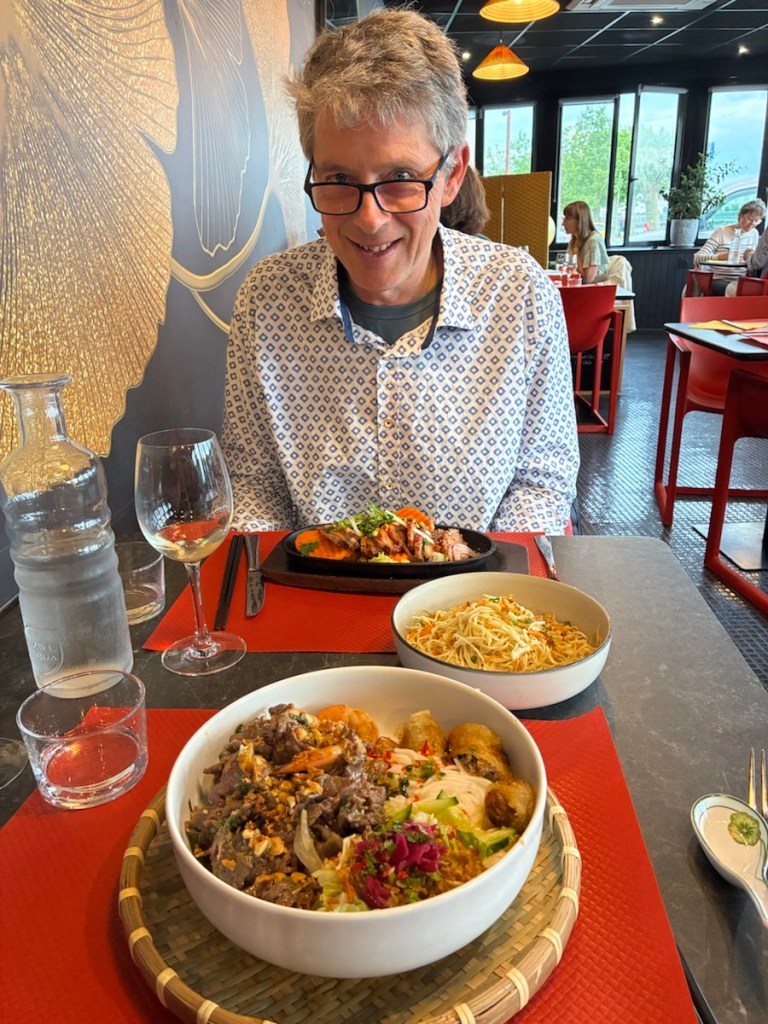 The largest green leaves are sorrel. The wine pairing was a delicious Riesling.Get used to eating tiny flowers. The mousse was flavored with ground ivy.Barbecued white asparagus, paired with Cote du Rhone Amour de Fruits.BBQ white asparagus with pistachios and pith of citrus. Amazing.The squab course, served with Le Migmatite Gamay Sur Granit. Which translates as delicious red wine. Düwehof pigeon breast, thigh with giblets, porcini mushroom praline, green asparagus, stuffed morel and wild garlic, Mokxa coffee-infused jus. The wild garlic is the small dark lump, it’s cooked in a rice cooker.Pigeon thigh with giblets. Yes, very rich this course.The palate cleanser, rhubarb sorbet in a delicate apple and herb sauce.With the dessert course an elderflower cider, Cidrerie de Reillon Grégoire Jacquot Fleurs de mal 2023 • Pétillant de miel. Strawberry horseradish ice cream, and a white chocolate top. Sprinkled with little white flowers.And finally, more little dessert treats. Raspberry tartlet, and a small Financier Cookie.Chocolate truffles on a bed of cacao nibs. It was a good thing we’d been bike touring for almost 70 days and our metabolisms were running high.
