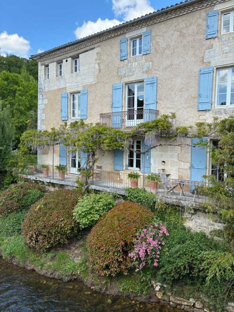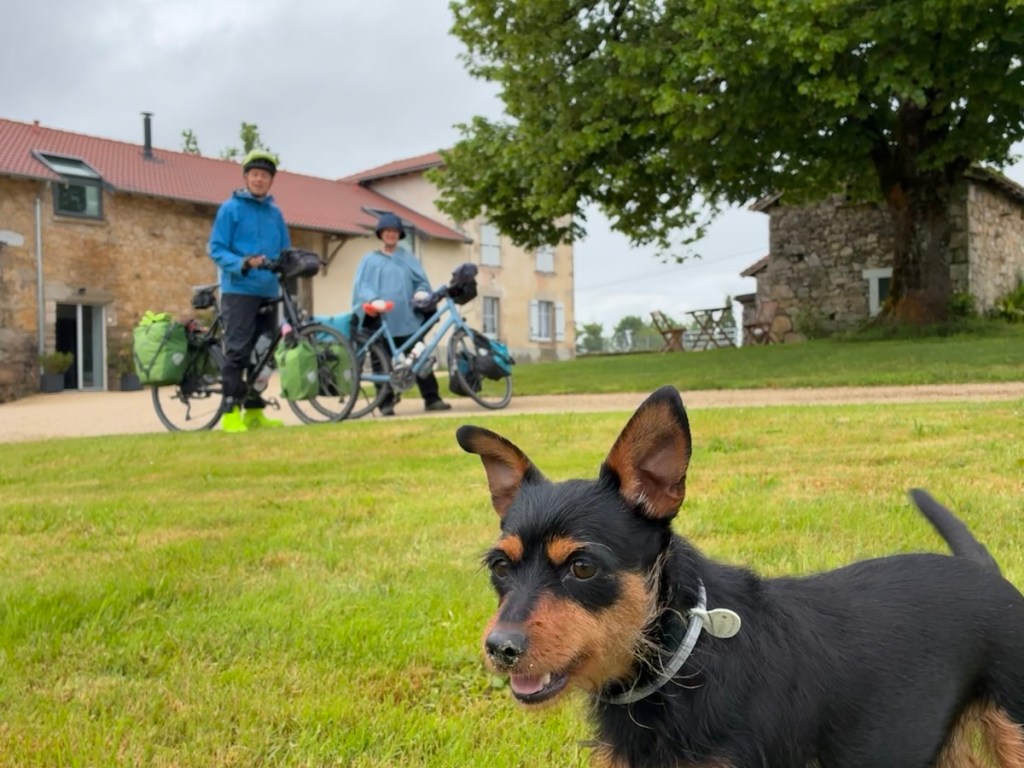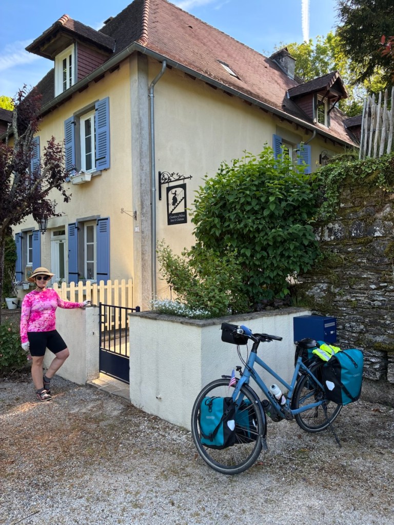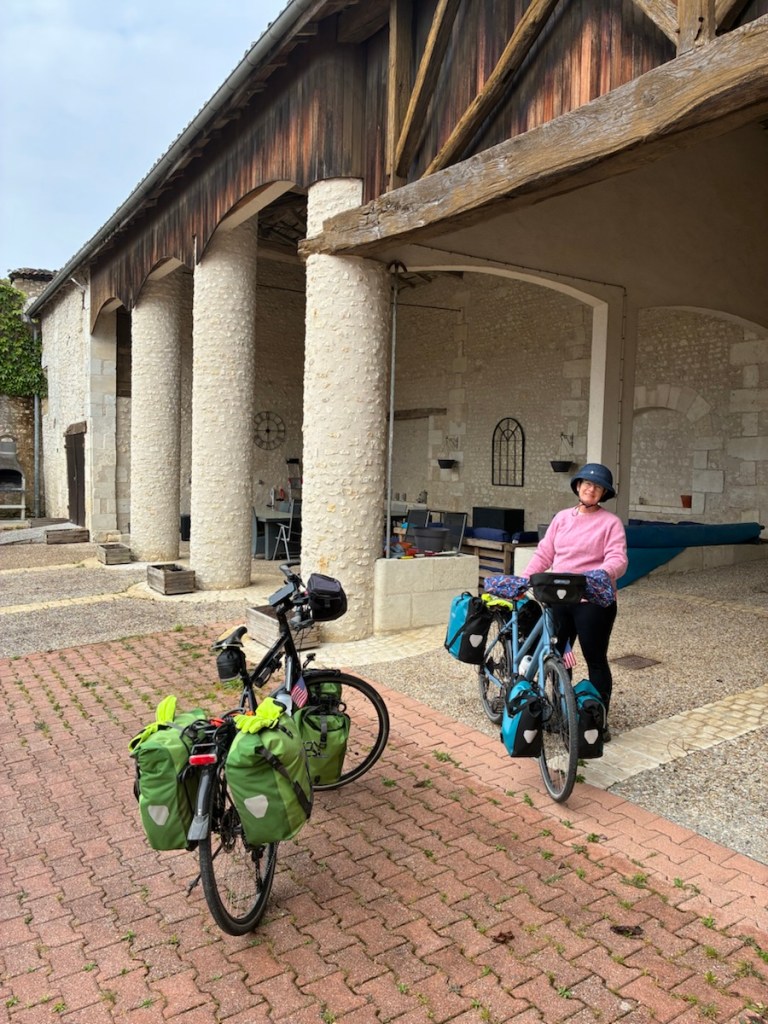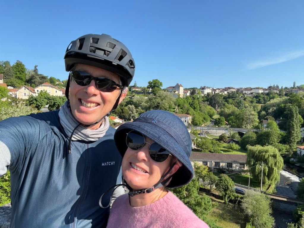 The path only hugs the Touvre for half its 12km length, so off we went on Eurovelo 3, la Flow Velo, Tour Charente, and one I can’t even read. Again, just amazingly detailed history signs. Our average speed was going down down down with all the stopping and learning.Tiny little tunnels that ran under the rail line originally for small tractors and livestock.History- the line of demarcation.Separating free France from occupied France in World War 2.Really, how can we get anywhere when there is so much to learn, and then we need to stop to eat.Peppers and cheese on crackers today. And cute dogs to snuggle. This is Cola, his owner, a lovely Irish woman, had been living in France for over twenty years.More stops for artsy photos. More up and down roads where the rail trail, the Velo Flow, couldn’t follow the rail line.An old mill which powered the forge which made cannons for the French military. Nontron, our destination for the night. How do you even keep a building this old standing?Another quirky, cold, not super well run lodging.The Velo Flow crossed over a newly restored trestle. Nontron has some tourist gold with this bike path and a lovely town.Nontron on the hill. Back on the bikes! Ride! Oh wait, divert to cute cafe in Saint-Jean-de-Côle where the town was prepping for a flower festival.Delicious cookies at the Pink Elephant Cafe.So many pink elephants.Ready for the festival.On the Côle River another lovely house.Carry on! Headed to Jumilhac-le-Grand for the night. Highly rated BnB, two restaurants in town. What can go wrong?Both restaurants closed. We threw ourselves on the mercy of the one bar open, not serving food that Friday night, and the lovely proprietors fixed us what she claimed would be a very simple meal. It was lovely.The group of ex-pats outside the bar happily absorbed us into their evening drink and chat and we spent a pleasant evening.A view of the privately owned Château de Jumilhac and gardens. Imagine keeping that repaired and running.It’s a beautiful town, Jumilhac-le-Grand. Us after going from thinking we can choose between two restaurants, to pleading for food from the one place open. But again, lovely lovely people.Leaving Sous le Chateau Chambre d’hote. Very comfortable, very well run.Out of town up some more hill under the watchful eye of the school cat.And this stallion who looked like he was spoiling for a fight.