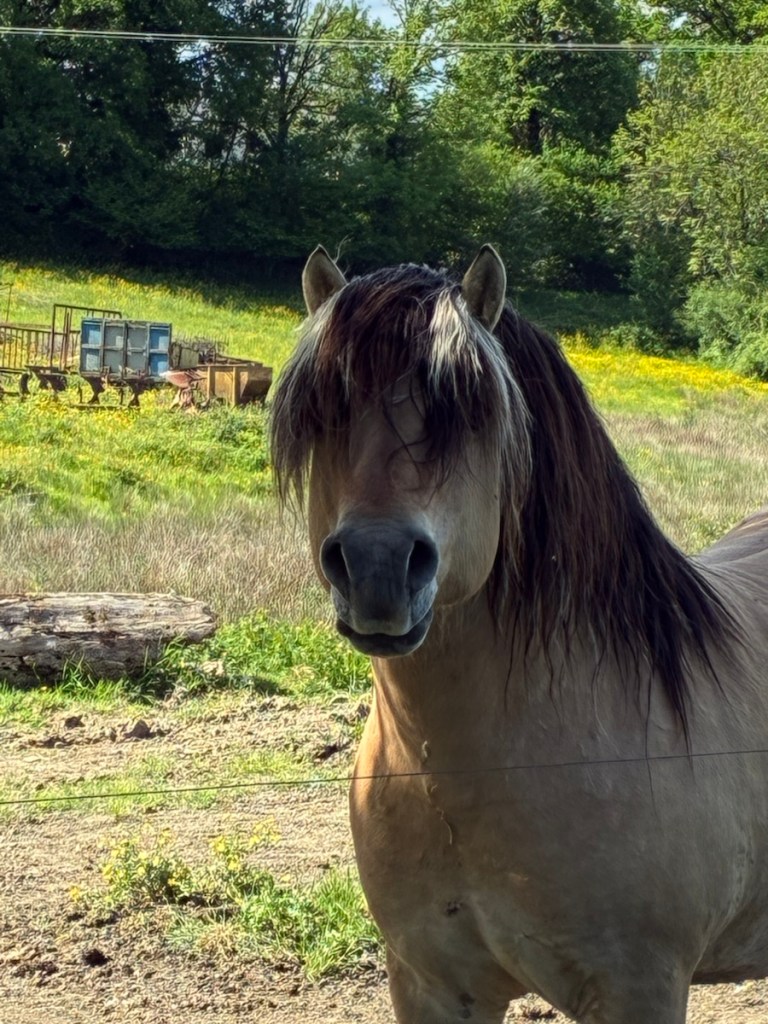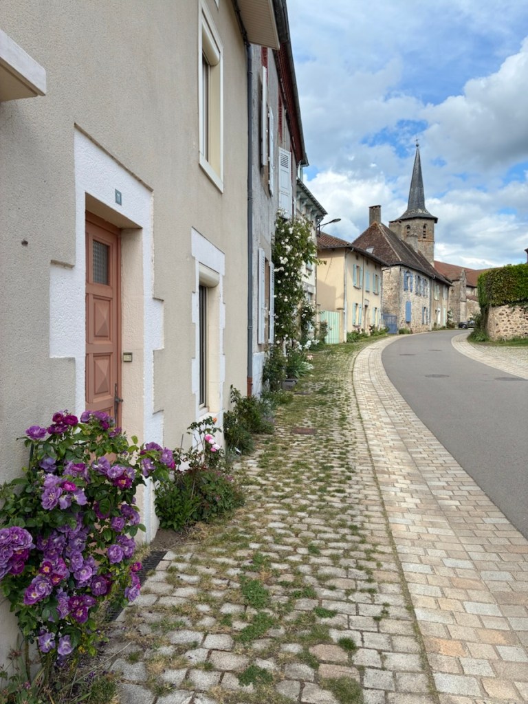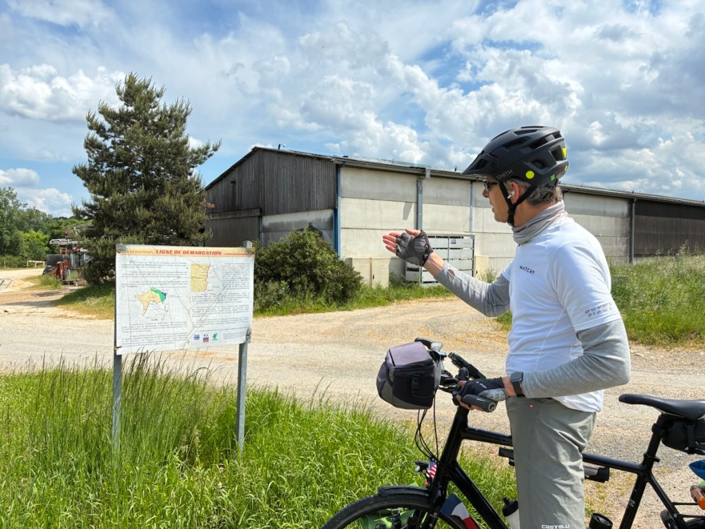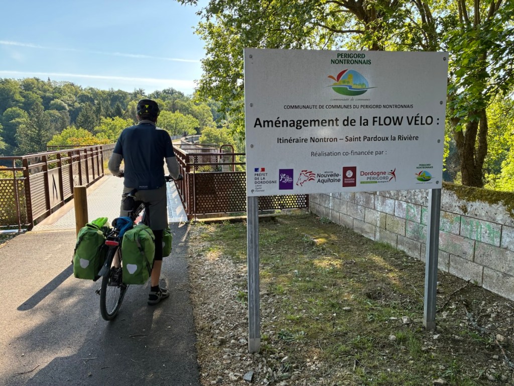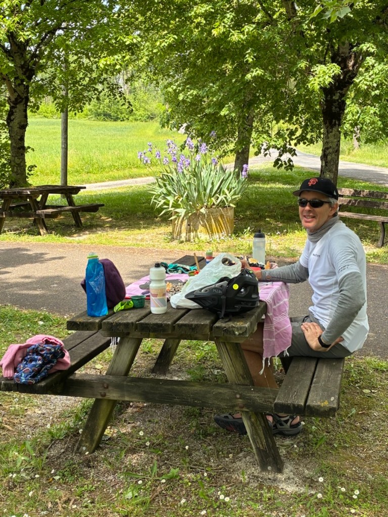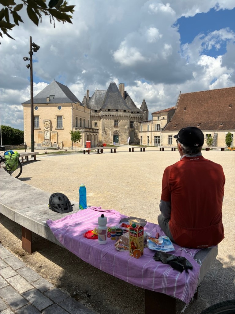 The path only hugs the Touvre for half its 12km length, so off we went on Eurovelo 3, la Flow Velo, Tour Charente, and one I can’t even read. Again, just amazingly detailed history signs. Our average speed was going down down down with all the stopping and learning.Tiny little tunnels that ran under the rail line originally for small tractors and livestock.History- the line of demarcation.Separating free France from occupied France in World War 2.Really, how can we get anywhere when there is so much to learn, and then we need to stop to eat.Peppers and cheese on crackers today. And cute dogs to snuggle. This is Cola, his owner, a lovely Irish woman, had been living in France for over twenty years.More stops for artsy photos. More up and down roads where the rail trail, the Velo Flow, couldn’t follow the rail line.An old mill which powered the forge which made cannons for the French military. Nontron, our destination for the night. How do you even keep a building this old standing?Another quirky, cold, not super well run lodging.The Velo Flow crossed over a newly restored trestle. Nontron has some tourist gold with this bike path and a lovely town.Nontron on the hill. Back on the bikes! Ride! Oh wait, divert to cute cafe in Saint-Jean-de-Côle where the town was prepping for a flower festival.Delicious cookies at the Pink Elephant Cafe.So many pink elephants.Ready for the festival.On the Côle River another lovely house.Carry on! Headed to Jumilhac-le-Grand for the night. Highly rated BnB, two restaurants in town. What can go wrong?Both restaurants closed. We threw ourselves on the mercy of the one bar open, not serving food that Friday night, and the lovely proprietors fixed us what she claimed would be a very simple meal. It was lovely.The group of ex-pats outside the bar happily absorbed us into their evening drink and chat and we spent a pleasant evening.A view of the privately owned Château de Jumilhac and gardens. Imagine keeping that repaired and running.It’s a beautiful town, Jumilhac-le-Grand. Us after going from thinking we can choose between two restaurants, to pleading for food from the one place open. But again, lovely lovely people.Leaving Sous le Chateau Chambre d’hote. Very comfortable, very well run.Out of town up some more hill under the watchful eye of the school cat.And this stallion who looked like he was spoiling for a fight.