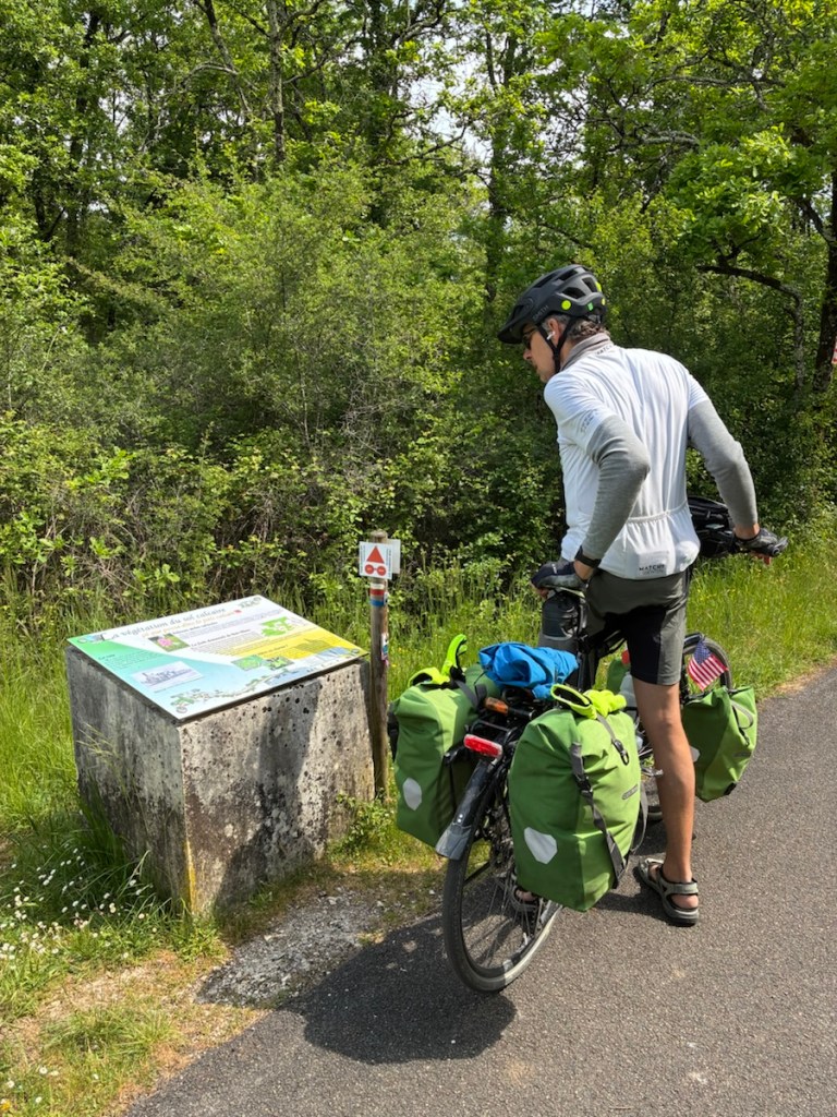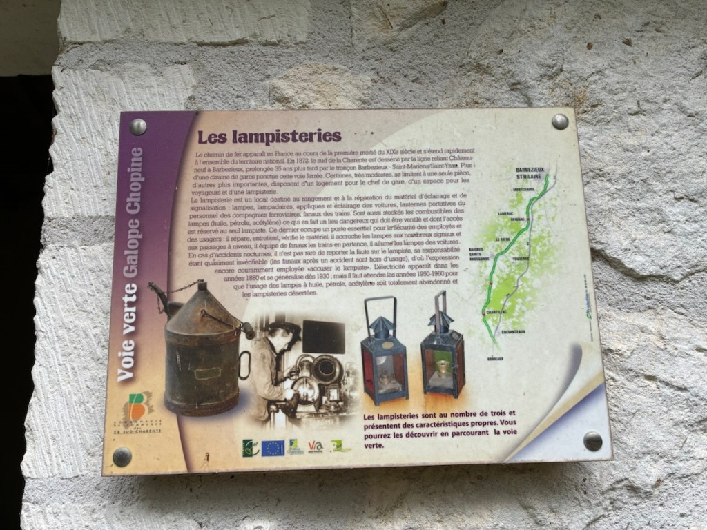 The wind may have been adding to our crankiness. There was so much seed fluff blowing around that my eyes itch just remembering it. Leaving Libourne. Later nasty car drivers! Attitude adjustment at the hyper market on our way out of town – the Wall Of Gazpacho! My favorite cycling lunch. Who could stay irritable when faced with these cartoon-character-like sheep?Or this cute calf grazing in a vineyard?Joining the Voie Verte at Clériic.Quite a lovely color scheme going on, the luscious green and bright white.Fantastic dinner at the wonderful Le Domaine du Haut Preau chambre d’hote. Run by a Belgium woman who does everything just perfectly while being so welcoming.It’s a beautiful old farm building.Back onto the Voie verte Galope Chopine. We didn’t make it far before the first informational sign beckoned us.All about the folks who worked lighting the lamps for the trains, and who were usually blamed for any crashes. This gives you a sense of the detail on the trail side signs. In a world of neon cycling clothing, be the fuzzy pink sweater. Outside of Reignac. First lunch. Second lunch in Barbezieux-Saint-Hilaire, with a chateau view.The view from the wall of the chateau. You can see Congnac noted on the map.Châteauneuf-sur-Charente, where we spent one night in a BnB in an old old building. Full of old old furniture.But with a friendly garden cat! Hello kitty. Creaky floors and loud plumbing is forgiven.
