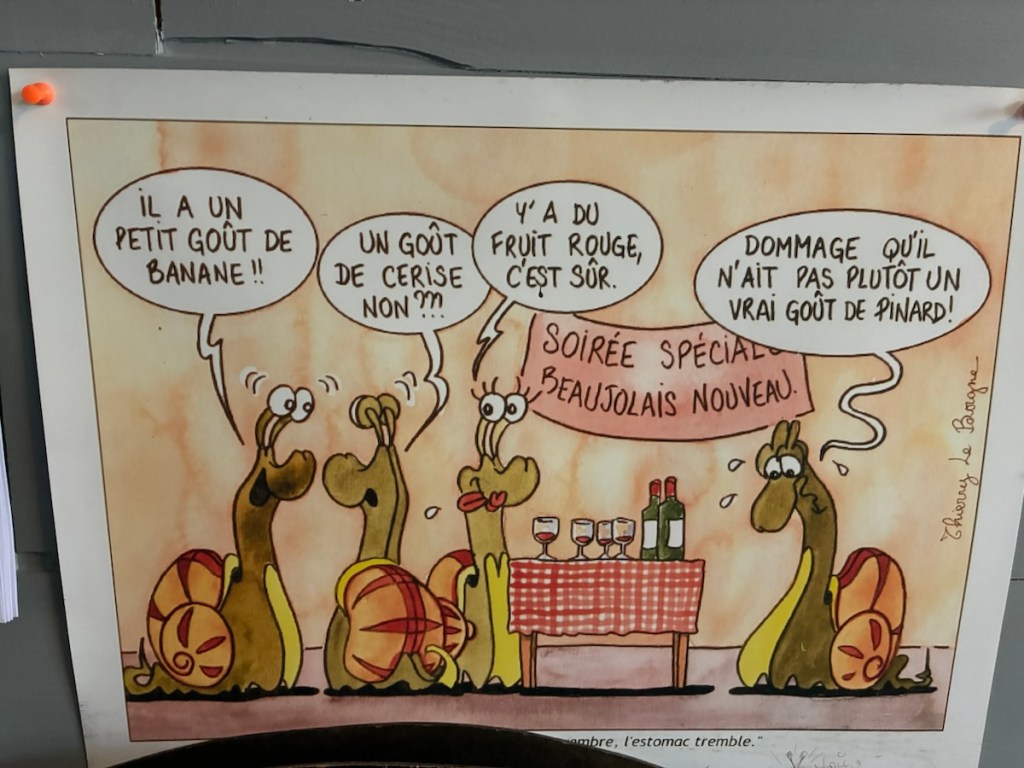 Cartoons by the town dentist. At the Beaujolais Nouveau party: “It tastes a bit of banana.” “A taste of cherry, no??” “There’s red fruit too.” Final snail “It’s a shame it doesn’t taste like real wine instead!” Local wine humor.“This is the only heaven where angels are not welcome.” I don’t get this one.Heading out of town to the riverside path called Le Velo Flow.The Charente River. I feel like we’re collecting French river badges. 381 kilometers long.It’s a beautiful river, with clean water which attracts swimmers, kayaks, and boaters.At Mosnac. Rich is grinning because I convinced him to ignore the sign saying path closed due to construction. Since it was VE Day the crew wasn’t working. It was a beautiful stretch of river.Time out for some artistic close ups of grape vines.How do we get anywhere, with all the photo stops?Our bikes posing for their glamour shots.Trois-Palis. We’re on our way to Angoulême, which we have just figured out is up on a hill.Such a fascinating town, Angoulême. Full of young hippy types, and hipster folks, against the backdrop of an old fortified city.