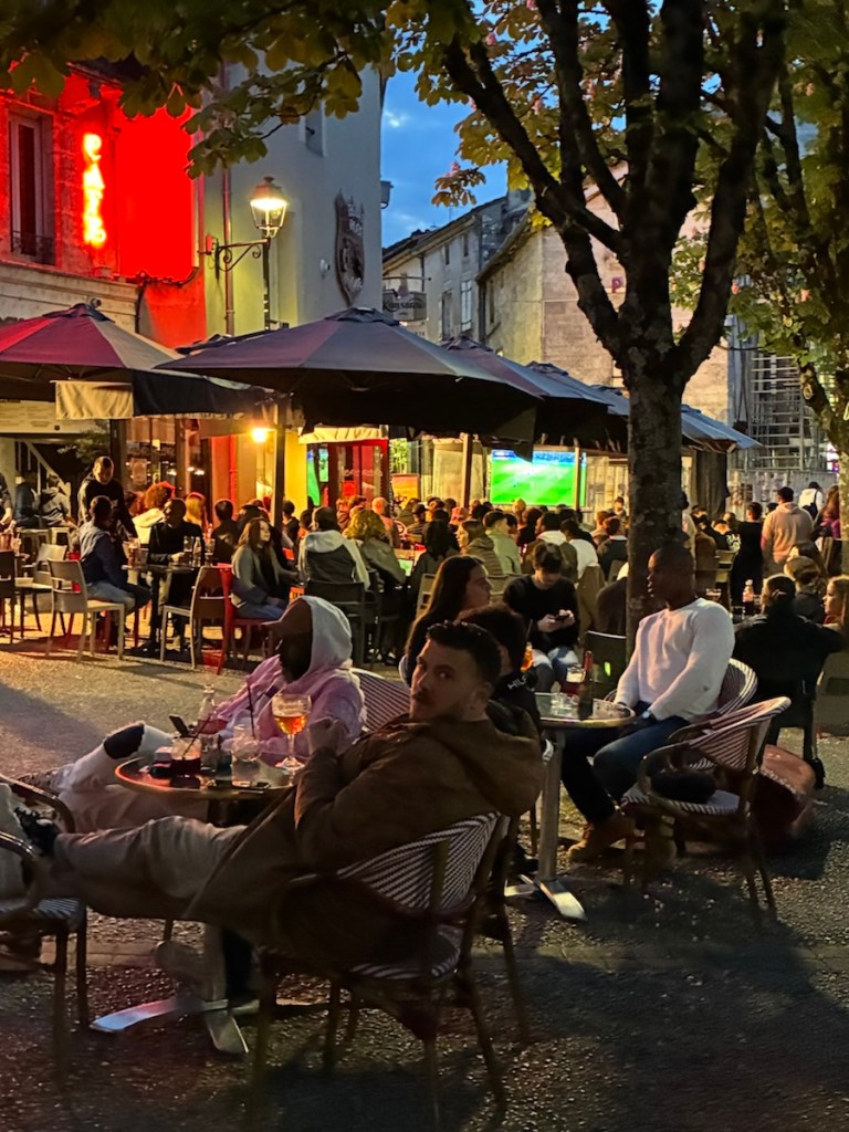 Football being shown makes for a lively evening on the plaza.I was hoping for the Green Mouse sign to be lit up after dark, sadly it was not. But how cute is that little pipe smoking mouse?The town is on a plateau overlooking a meander of the river Charente, and has the nickname “balcony of the south west.”The gorgeous murals I saw climbing up to town, and didn’t stop to photograph, made sense given the city’s visual arts connection. Here’s one from our ride down.