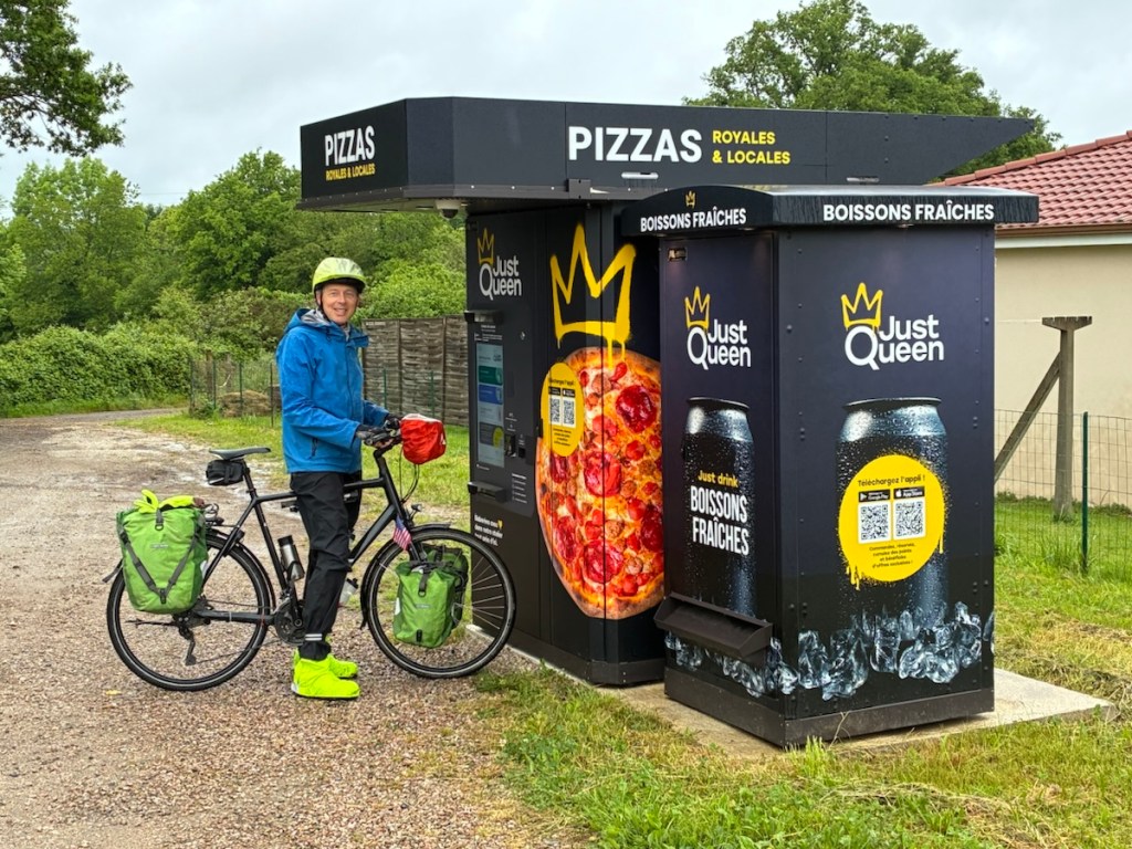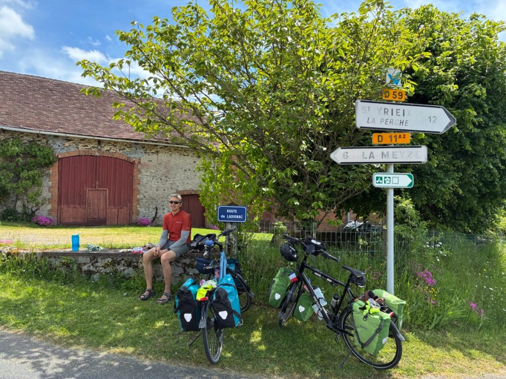 Our favorite sign of the trip. Richard the Lion Hearted Route.Who are the friendliest cyclists? The Spanish! We saw him twice in one day (failed to get his name), he was headed to Limoges that night, we had one more night on the road to Limoges.Downside of road riding, not many places to stop for a picnic lunch. This shady wall came through for us. Flavignac. It’s on a Camino Route. It’s on a bike route. The one new Chambre d’Hote will probably do quite well with a steady supply of hikers and bikers.I love the color of these roses. An easy walk into town along a small lake. What had been part of the owners barn was now accommodation.Breakfast greeter. We had a short day into Limoges so we tried to wait out the rain before heading out.What rain? Said the cute dog.Breakfast was pretty slim so we were tempted by the pizza machine. But heavy rain and no shelter made us decide no.Limoges! Arrived in the rain. Got a chance to walk around.We stayed for two nights, which was honestly one night too long. Other than the porcelain museum, Musée national Adrien Dubouché, which had an extensive collection of pottery, there was not a lot to recommend Limoges.A cute old town, but it was quite small, and ringed by unpleasant roads. Awful town in which to be a bike or pedestrian. On a hill. Long traffic signals. No bicycle infrastructure.So off we go! To the very dramatic train station. To catch a train.To Paris!From Bordeaux to Limoges. Each heart is a place we slept.