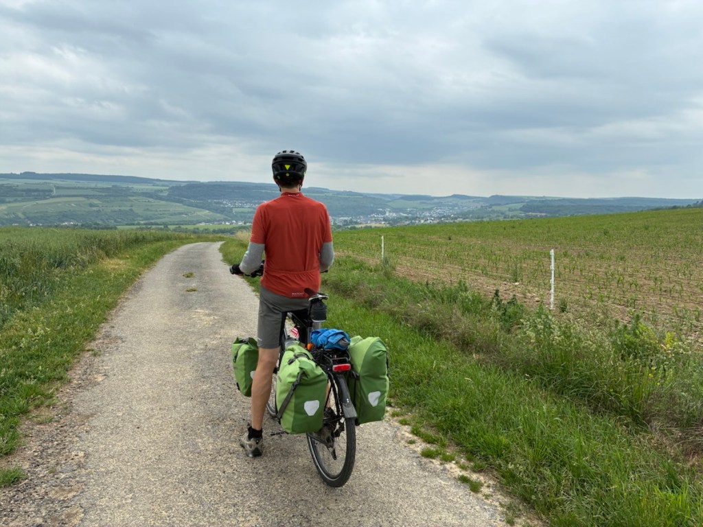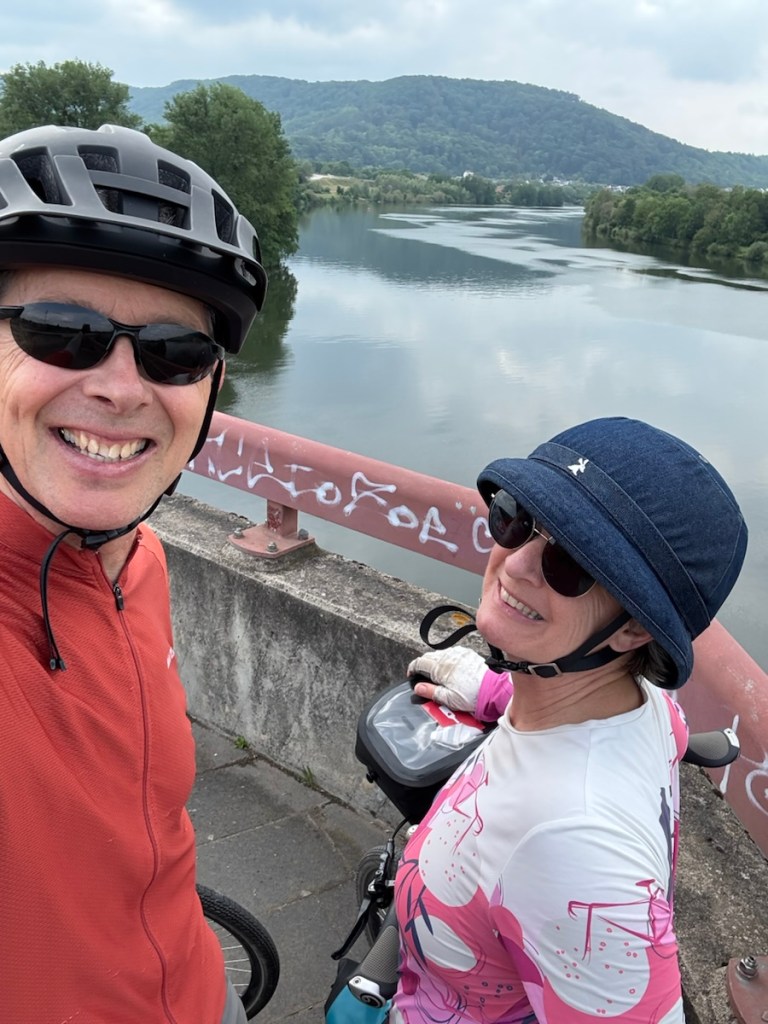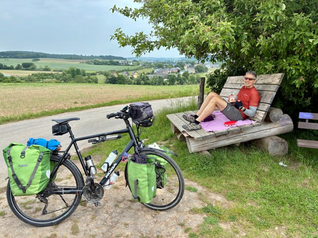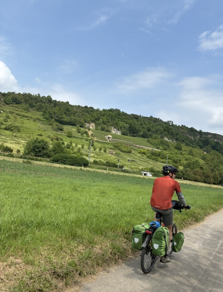 The Wasserfall Saarburg. Makes a lovely backdrop and sound for the restaurants and cafes. More impressive is the fact that this was a 13th century project to redirect the Leukbach River through town.The buildings rise right up from the river.The sound of the waterfalls and the cool air rising from the river are lovely.On our way out of town after a one night stay. That look says, can we just ride and not stop for photos every five minutes?Heading out along the Saar River. It was a calm morning, no wind.My dashboard. Many podcasts have been played on that Bluetooth speaker over the weeks of bike touring. Germany can be relied on for good paths linking you from city to city, town to town. We’re up from the river on this stretch by an industrial site.We headed up and over a hill to avoid a big bend in the river. Shortcut? Eh..it was steep so no real time savings, but what a view.Could this tree be any more classic and beautiful? Big sweeping limbs, check. Picturesque hollows offering tantalizing home for small furry creatures, check.Ah, the bike signage of Germany.Ah, the pastries as big as your head of Germany.