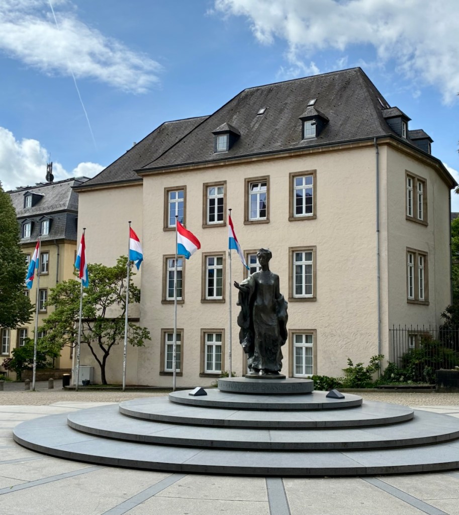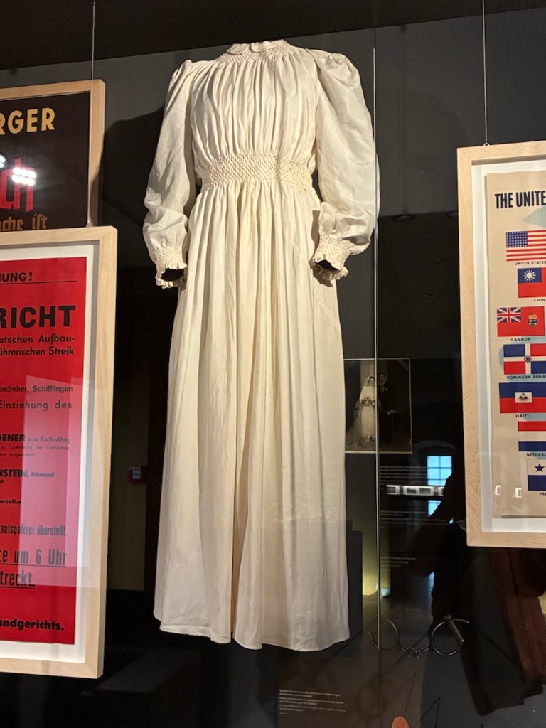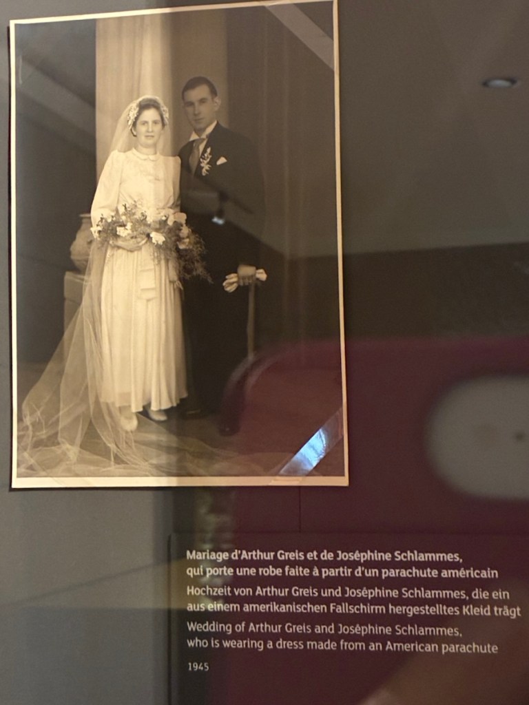 The view from the Luxembourg City History Museum.A wedding dress made from the silk of an American parachute.Their 1945 wedding portrait. The human spirit endures. Imagine what trying times those were to embrace the future and go forward. Bravely.Statue of Charlotte, Grand Duchess of Luxembourg from 1919 to 1964.Luxembourg coat of arms.