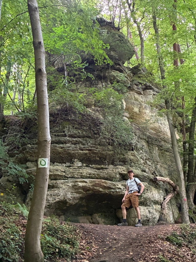 Over the bridge to our destination for the night, Saarbrücken.Recovery beverages for the win!What’s the easiest bike parking? In our hotel room. Doesn’t happen often but boy it’s nice. Roll in roll out. In this case it was roll out into a steady rain.Never stop smiling. We’re headed 25k to a train station to take a hop to shorten the day.Off the train at Diemeringen and we’re back in France! Feeling sassy. Drinking Sassy French cider at a Breton crepe restaurant lunch break to avoid the storm.We don’t often stop for a sit down lunch, but we had hoped to hunker down and avoid the worst of the storm. Delicious crepes. Very friendly locals.The rest of the day cycling was a series of hops to shelter from heavy rain. Overhangs at town halls, under a barn roof, and this community park with a covered picnic area. The storm moved slowly across the region so we didn’t avoid much of it, but we managed to duck out during some particularly heavy bits.We rolled into Eschbourg and marveled at Maisons des rochers de Graufthal. These houses were built into a rock cliff and the last inhabitant died in 1958. It’s now a museum.