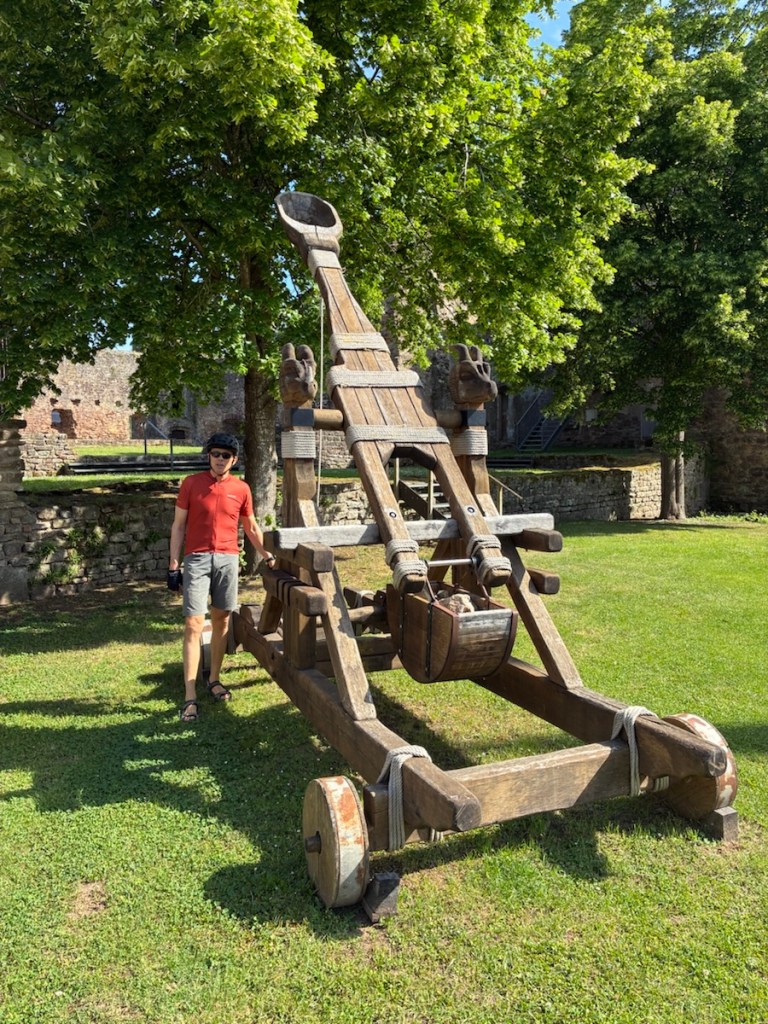 Hike day! A short bus ride to Mersch and a quick stop to admire the dragon fountain, emblem of the town. And up into the hills on the well marked hiking and mountain biking trails.The sandstone rock formations were fantastic.Confused legs, what’s with the hiking – we usually just bike.OK legs, have a rest.The next day it was a train trip to the town of Wiltz.We had lunch and a wander around town.I love the old hanging signs. And a beautiful clock.Old and new hanging sign.The history museum had a big section on beer and breweries.And then back to our kitty cat on the (all together now) Free Train!Our bikes were feeling left out so we went out for a spin and a grocery store run.And to admire the catapult, or trebuchet, at Pettingen Castle.Carved detail of a dragon.The climbs in Luxembourg are not huge, but long sustained climbs with rewarding views. Oh, and sometimes very steep too.On our last day we took the bus back into Luxembourg City to have another look around.It was a quiet Sunday morning.It’s a beautiful old town.The Alzette River makes a horseshoe bend through the city.Is that a funicular? Is it free?Yes and yes. The Pfaffenthal-Kirchberg Funicular.Our cat sit was over and it was back on the bikes to ride out of Luxembourg and on to Germany which would be our fifth country of this bike tour.The cows of Luxembourg will miss us, I’m sure.This was the field where we stopped to watch and listen to skylarks. And we got a fantastic lunch spot. We call these BarcaLoungers.The signposts with so many routes!The Betzder Panorama Tour Shortcut!That’s Germany over there.We’re about to drop down to the Mosel (or Moselle) River, I have my downhill smile on!The Moselle River is the border between Luxembourg and Germany here.Right before we leave Luxembourg there is a bike repair station. Is it to prove to arriving Germans that Luxembourg is welcoming to cyclists? Or to wish you good luck on your time in Germany? Whatever the intent, very nice.A sad border shot. There was a constant flow of cars so no car free photo. Vineyards along the Moselle.The happy Travelers at the confluence of the Mosell and the Saar Rivers. Not the most dramatic confluence.