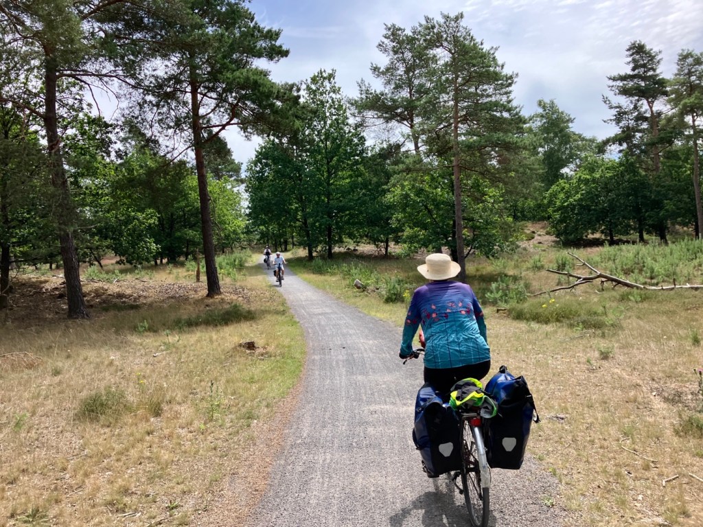 Warm enough that I switched to my hat from my helmet. I love that it feels so safe in the Netherlands that I can do that.Signage along the National route we took.So much of the route was completely car free. And a lot was asphalt free as well.Way finding is still necessary though. Rich mixes in some Komoot routing. Shaded spots to stop were very welcome.Ah… finally Zwolle.