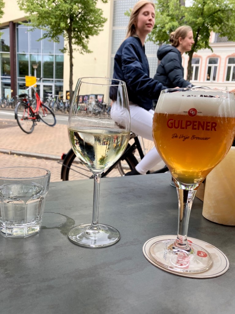 Enjoying a Groningen evening with drinks and the parade of people on bikes.