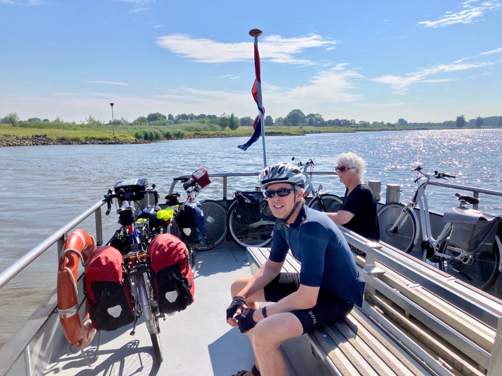 Leaving Zwolle, another physical separation of bikes and other modes.A ferry just for bikes and pedestrians across the river IJssel. On a long hot day sometimes the only thing that sounds good is cold chocolate milk! Still smiling.Big guy and a big bike.