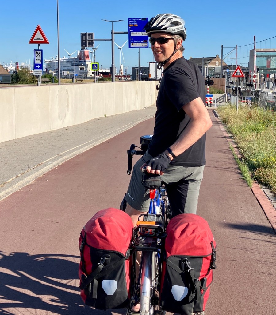 Although we only slept one night in The Hague, our ferry didn’t start boarding until 7pm for a 10pm departure. So we had a full day for a museum visit and buying replacement panniers for me, my old ones having failed and no chance of getting them repaired before we left town. I left them at a bike shop who said they would repair and put them to good use and we pulled out of town around 4pm to ride the 28 kilometers to the ferry terminal. A good travel tip for transition days is to stay at a nice hotel, if you can. The staff at the Mövenpick Hotel were super helpful and we left our bikes and bags after checkout, visited the Mauritshuis Museum, and then picked up just the bikes and set out to get a new set of Ortlieb panniers for me. Back to the hotel, unpack and pack panniers, drop off old panniers and head out to the ferry.
