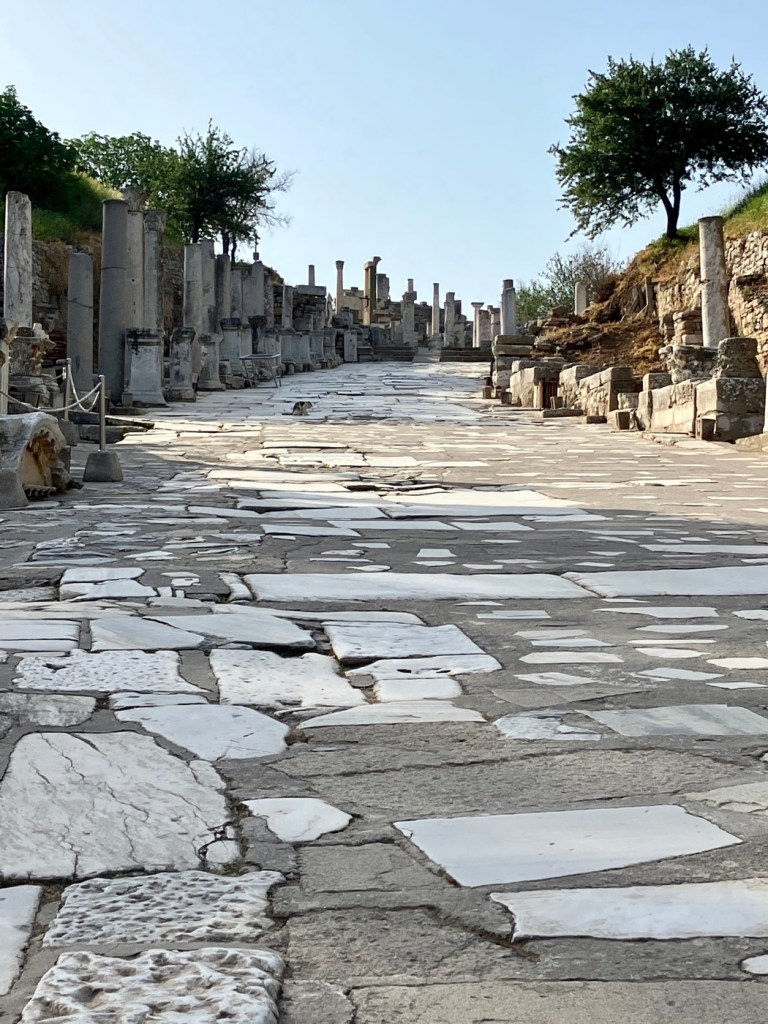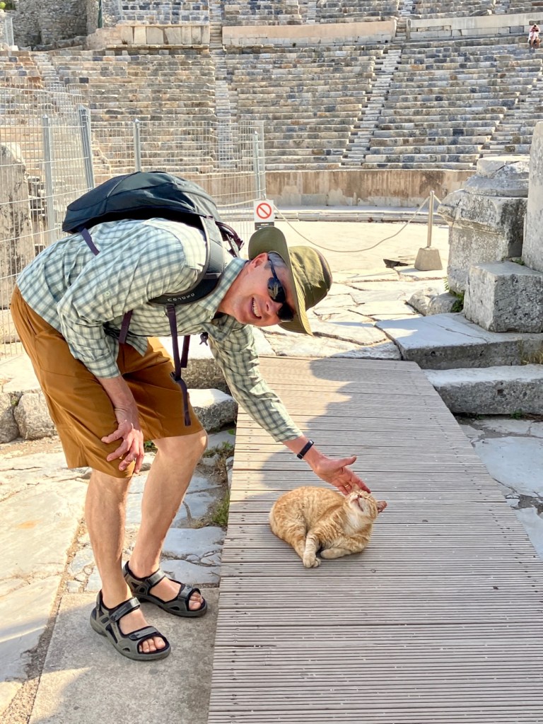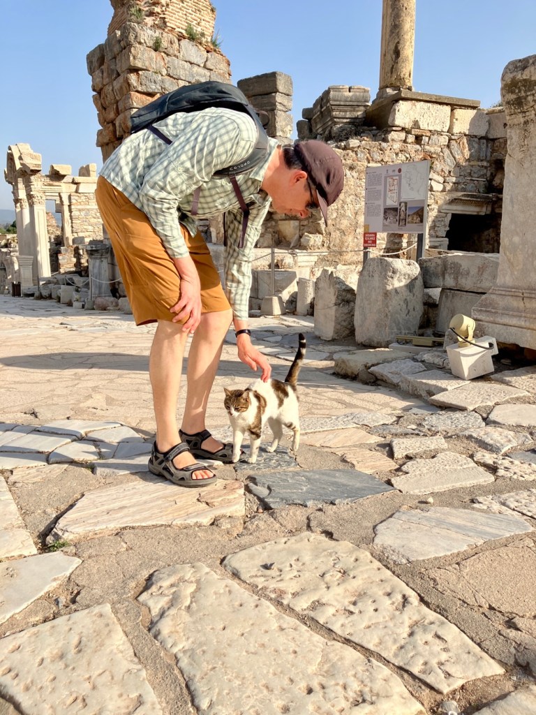 Rich at the upper gate of Ephesus. See, this look says – no one else here yet. Looking up the main road of Ephesus. I am always fascinated by the paving stones. Some of these bore the initials of the workers who laid them in place.Rich walking down the main road of Ephesus. The harbor used to be very close, but as it silted up the town struggled and eventually failed.Quickly waylaid by a friendly Turkish cat.The Library of Celsus, the most recognizable and amazing structure of the site.