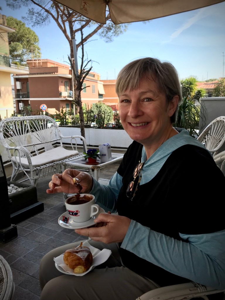 New family friends in Italy after a typical Italian breakfast of a Cornetto and caffe.