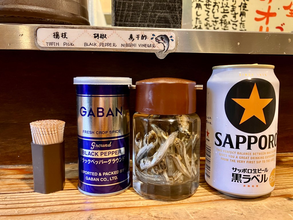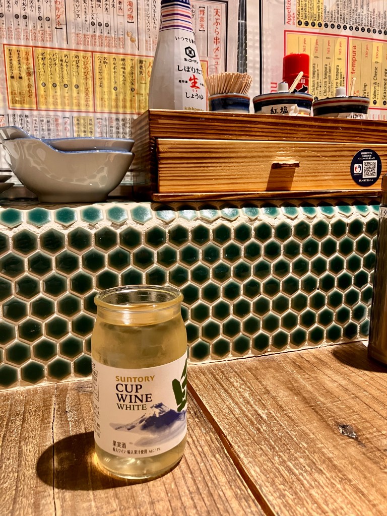 Fairly unassuming from the outside, this Yatai bar.But inside is magic.My pomegranate daiquiri. Rich with a martini. Round one.The tools of the trade. Apparently it takes 3 hours to set up this Yatai each day. And 3 to take down.My daiquiri and Rich’s mojito. Round two.A super fun young recently engaged couple from Osaka. We were communicating with English and google translate. And on Rich’s left two young women, engineers who had studied in Canada. Boiled peanuts and potato chips (gone already) were the bar snacks which the cover charge supplied. Yes, we have that beer mat. Again, it’s a seriously cozy space. You sit closer to strangers then you would anywhere else.