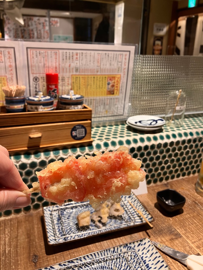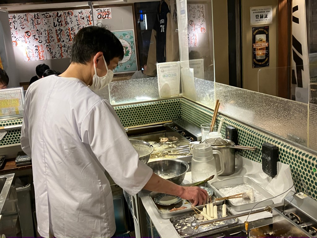 That is a Yatai.And this is a Yatai. You look below curtain level to see if any seats are available, or you look for a line of patient customers waiting.Rich added for scale. We had dinner at this one. Not much room inside to take photos. And you don’t linger after dinner. For one, it’s not the most comfortable seating ever. And the owners need to turn the seats when there are only six or seven of them.Not much room to cook either, but the chefs were making it work. It’s warm and cozy once you’re behind the curtains.