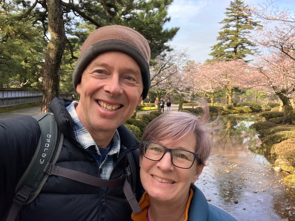 A very apt warning sign. I will not miss hearing Rich’s head connect with room doorways, low hanging light fixtures, and train doors. We hang things from the doors in our rooms as mitigation.Sunset light on the happy travelers in Nagasaki.