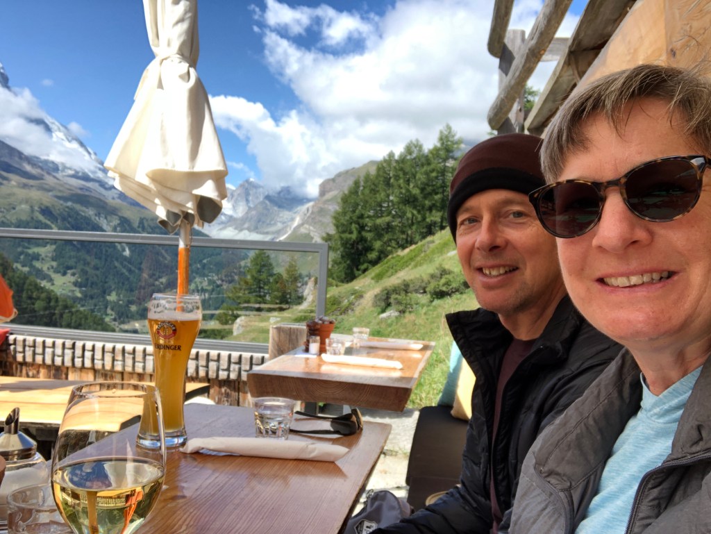 Mid hike lunch on a mountainside terrace.The ride out of town was interesting, showed how much infrastructure is required to support this “car free” town. All sorts of domestic animals on our ride down, including this big guy who had just walked slowly through irrigation sprinklers and came over to slobber and shake on me.