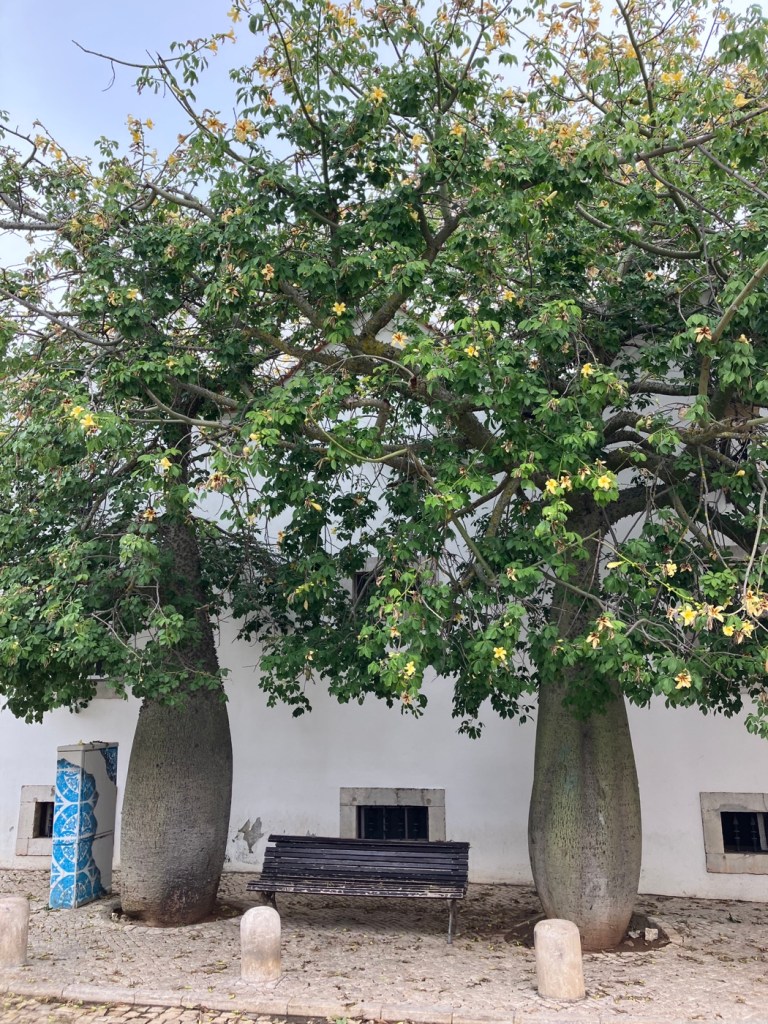Keep that positive mental attitude going. A lovely almost 3 hour lunch in Cascais, a short train ride from Lisbon. We chatted for ages with a super nice Canadian/British couple at the next table. Symmetrical potbellied trees. I think they are Queensland Bottle trees. Whatever they are – cute! Rooster joining our coffee break.