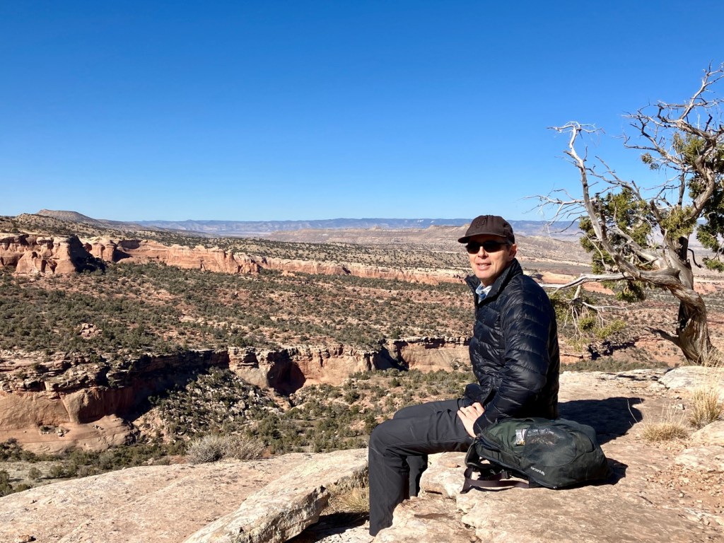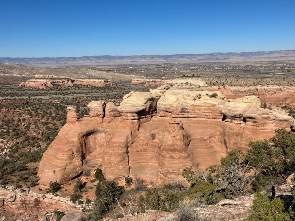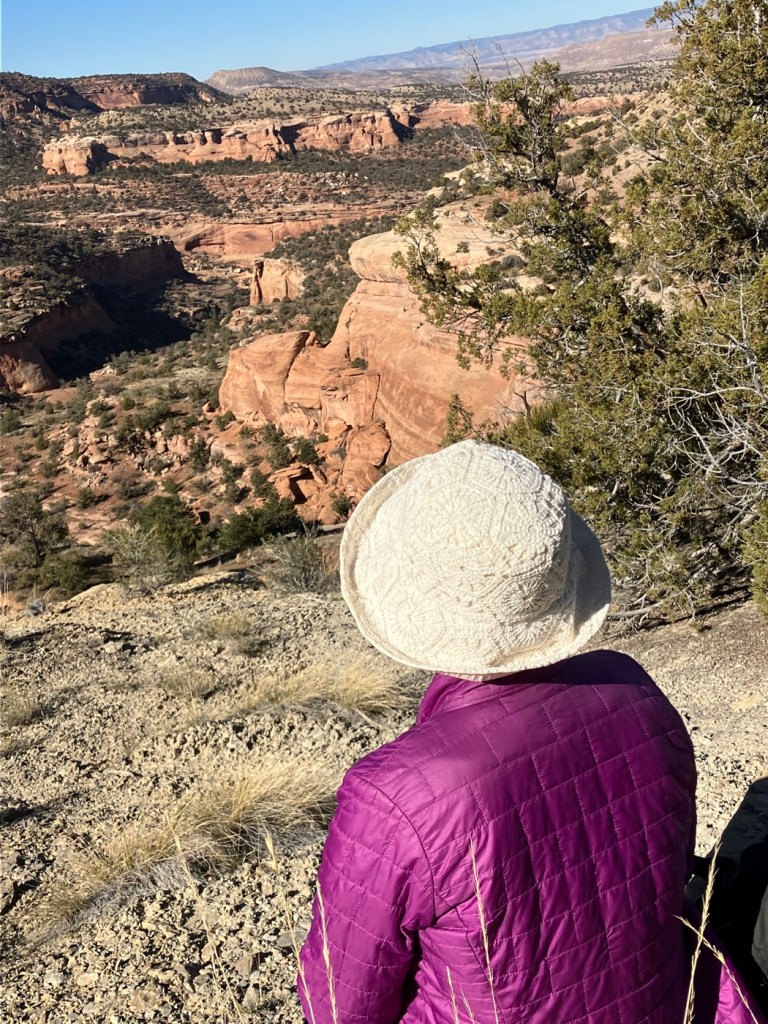 The view hiking from Pollock Bench trailhead, Fruita Colorado.Snack stop spots of the world.No matter how often we see the red rock canyons of Colorado the formations are stunning. Tasha the big guard dog, and the setting sun lighting up the book cliffs.Barn cats enjoying the sun. And waiting for food.Everyone gets in on the sunset photo shoot.“What? Am I not a cow?”Checking out the newest brew pub in Fruita.Tasha looks calm and cool here, but when she saw a fox and tried to take off after it, I was happy Rich was in control of the leash. Thank you Colorado. We got our Covid booster from a lovely team on this bus.My sister came home and brought back the newest addition to her household. 12 week old Lorelei. The happy travelers looking forward to a family Thanksgiving.